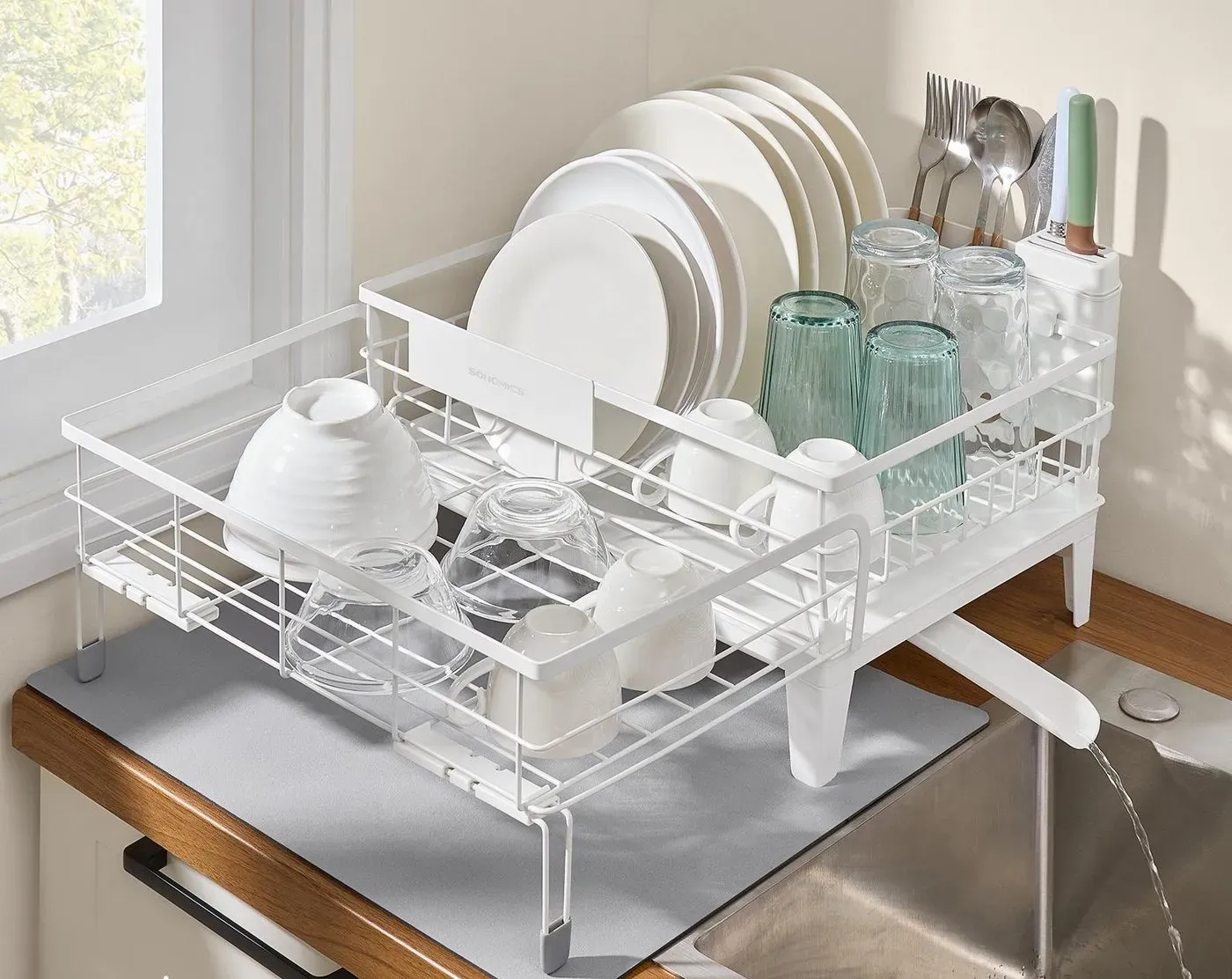 lieferbar-in 3-4 Werktagen bei dirSONGMICS Geschirrständer Abtropfgestell, Abtropfgestell Geschirr, 360 drehbarer und ausziehbarer Ablauf weiß 56 cm