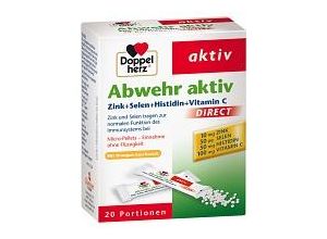 Verfügbarkeit: 1-2 Werktage - 0,15 €/Stück - Kategorie: Nahrungsergänzungsmittel - Doppelherz - GTIN:4009932003451 - PZN:11616129 - Nahrungsergänzungsmittel sind kein Ersatz für eine ausgewogene und abwechslungsreiche Ernährung und eine gesunde Lebensweise.Doppelherz Abwehr aktiv DIRECT mit Zink + Selen + HistidinWohlschmeckend + besonders leicht einzunehmenDoppelherz Abwehr aktiv DIRECT versorgt Sie nicht nur mit den Spurenelementen Zink und Selen sowie dem Vitamin C, die zur normalen Funktion des Immunsystems beitragen, sondern schmeckt auch ausgezeichnet.Durch ein modernes Herstellungsverfahren ist es gelungen, eine moderne und praktische Darreichungsform zu entwickeln. Doppelherz Abwehr aktiv DIRECT enthält seine wertvollen Nährstoffe in Form von Micro-Pellets. Den Portionsbeutel aufreißen, den Inhalt direkt auf die Zunge geben und die feinen Granulatperlen lösen sich in Sekundenschnelle auf. Sie können so jederzeit und an jedem Ort ganz ohne Flüssigkeit geschluckt werden. Diese Darreichungsform ist daher besonders gut geeignet, um den Körper schnell und direkt mit den Spurenelementen Zink und Selen sowie dem Eiweißbaustein Histidin zu versorgen €“ ideal für unterwegs oder bei Einnahmeschwierigkeiten von Tabletten.Zink und Selen sowie Vitamin C tragen zur normalen Funktion des Immunsystems und zum Schutz der Zellbestandteile vor oxidativem Stress bei. Zink ist auch an der Zellteilung beteiligt. Selen unterstützt zusätzlich die normale ... Mit 6.23 Euro für 40 Pellets ist dies eine kostengünstige Option für eine größere Menge an Direkt-Pellets. ![]() ![]() Doppelherz Abwehr Aktiv DIRECT Zink + Selen + Histidin + Vitamin C 40 St