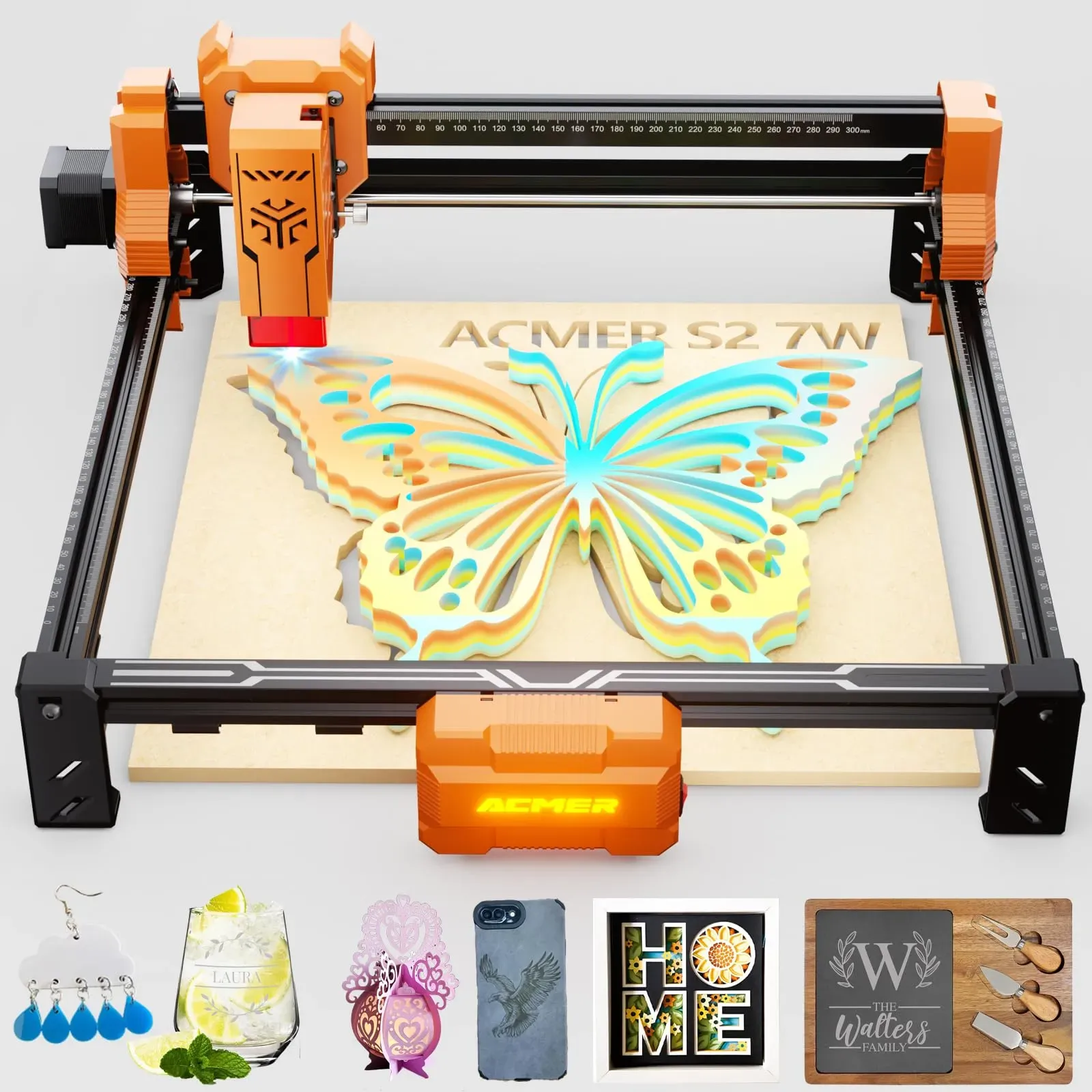 Auf Lager Versand durch AmazonACMER S2 7W Laser Cutter, 48W Ausgangsleistung Laser Graviermaschine, 300x300mm, 10000 mm/min, Holz Lasergravierer für DIY-Chargenanpassung, Bildung und Unterricht, Modellbau, individuelle Geschenke