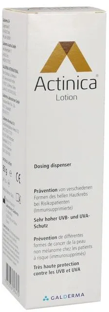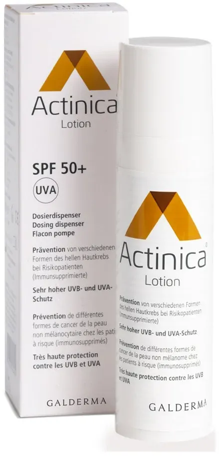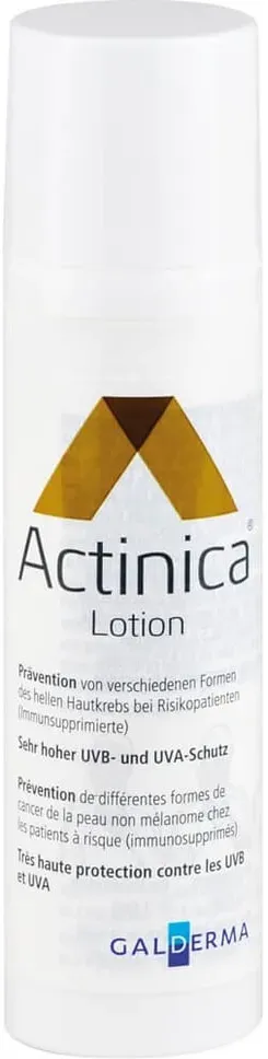 Actinica - EAN: 7612076396470 - Wenn aus Schutz Prävention wird -Actinica Lotion zum Schutz Ihrer Haut Haben Sie besonders helle, lichtempfindliche Haut?Arbeiten Sie seit Jahren unter freiem Himmel?Haben Sie ein dauerhaft geschwächtes Immunsystem?Oder gab es schon einmal Hautkrebs in Ihrer Familie?Wenn Sie nur eine dieser Fragen mit ja beantwortet haben, ist Ihr Risiko für Hellen Hautkrebs erhöht. Was ist Actinica Lotion?Actinica Lotion ist ein klinisch geprüftes Medizinprodukt mit einem sehr hohen UV-Schutz. Die Lotion wurde speziell für Menschen mit erhöhtem Risiko für Hellen Hautkrebs entwickelt. Actinica Lotion ist das einzige zugelassene Medizinprodukt, dessen Wirksamkeit in der Prävention von Hellem Hautkrebs in einer klinischen Studie belegt wurde.* Bei regelmäßiger Anwendung von Actinica Lotion traten bei immunsupprimierten Patienten deutlich weniger Aktinische Keratosen und Plattenepithelkarzinome auf. Actinica Lotion enthält eine Kombination moderner photostabiler UV-Filter. Der UVA- und UVB-Schutz entspricht der höchsten Kategorie sehr hoher UV-Schutz . Eine zusätzliche Anwendung von Sonnenschutzmitteln ist daher nicht notwendig.Actinica Lotion besitzt zusätzlich feuchtigkeitsspendende Eigenschaften, um die Hautbeschaffenheit zu verbessern. Durch den Verzicht auf Duftstoffe und PEG-Emulgatoren wird sichergestellt, dass die liposomale Lotion gut vertragen wird und angenehm ist. Einfache und komfortable Anwendung: Der praktische Dosierspender hilft Ihnen, die ... Dieses Angebot ist eine preiswerte Option für die 80g Actinica Lotion. ![]() ![]() Actinica Lotion Dispenser 80 g