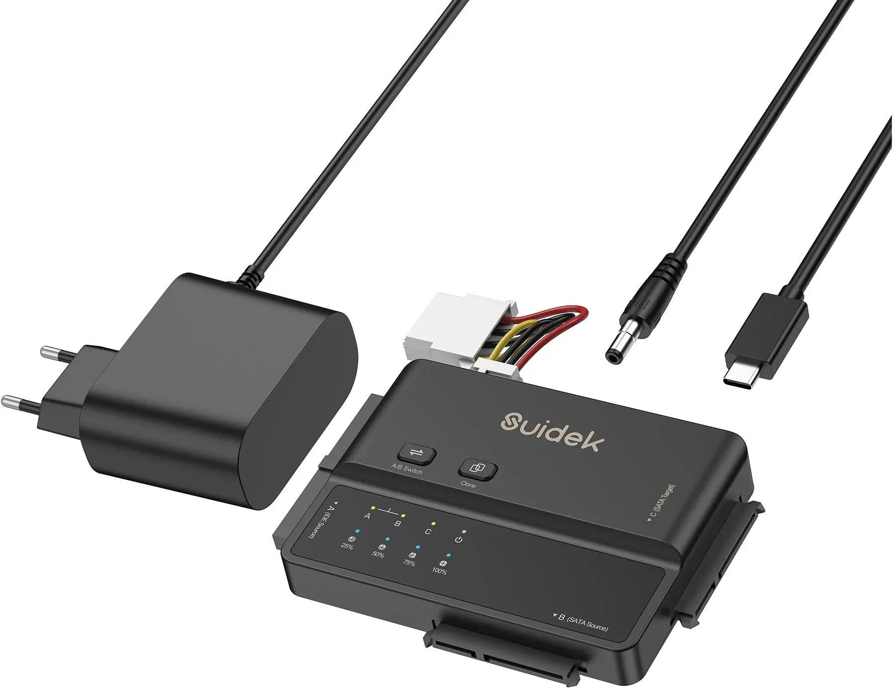 Verfügbarkeit: Auf Lager - Kategorie: Festplatten-Zubehör - suidek - Breite KompatibilitätDer IDE- und SATA-Adapter kann 2,5' oder 3,5' SATA SSDs/HDDs sowie 3,5' IDE HDDs unterstützen. Der SATA auf USB Adapter ermöglicht die gleichzeitige Verbindung von 2 Festplatten für den Datentransfer: IDE(A) + SATA(C) oder SATA(B) + SATA(C). (Bitte beachten Sie, dass IDE(A) und SATA(B) nicht gleichzeitig angeschlossen werden können.) Offline-KlonenDer Festplatten kloner ermöglicht Offline-Klonen ohne Computer. Drücken Sie einfach die Klontaste 3 Sekunden lang, bis das erste blaue Licht (25 %) blinkt. Offline-Klonen wird nur mit folgenden Kombinationen unterstützt: Quelle IDE(A)/SATA(B) Ziel SATA(C). Kapazitätsanforderung: Ziel ¥ Quelle. (Hinweis: Stellen Sie sicher, dass die Zielfestplatte eine größere Kapazität als die Originalfestplatte hat. Für das Offline-Klonen ist eine Stromversorgung erforderlich, und das Upstream-USB-Kabel muss abgezogen werden.) 5Gbps USB SATA SSD GehäuseDer IDE zu SATA Adapter ist mit einem USB 3.0 Anschluss ausgestattet und kann Datenübertragungsgeschwindigkeiten von bis zu 5Gbps bieten. übertragen Sie große Dateien innerhalb von Sekunden! Es ist auch rückwärtskompatibel mit USB 2.0 und USB 1.1. Die Festplatten-zu-USB-Konvertierung unterstützt UASP, was 70 % schneller ist als der herkömmliche USB 3.0 Plug and PlayDer USB Adapter für Festplatten erfordert keine Treiber oder Software; einfach anschließen und nutzen, ... Der SUIDEK NVMe M.2 zu SATA Adapter ist eine sehr vielseitige Lösung, die NVMe M.2, SATA und IDE Festplatten unterstützt und somit maximale Kompatibilität bietet. ![]() ![]() SUIDEK NVMe M.2 zu SATA Adapter, USB 10Gbps Festplattenlesegerät, PCIe NVMe, SATA und IDE Adapter, SSD Gehäuse unterstützt M.2(M Key&M+B Key) SSDs Aller Größen, 2,5/3,5 SATA SSD HDDs und 3,5 IDE HDDs
