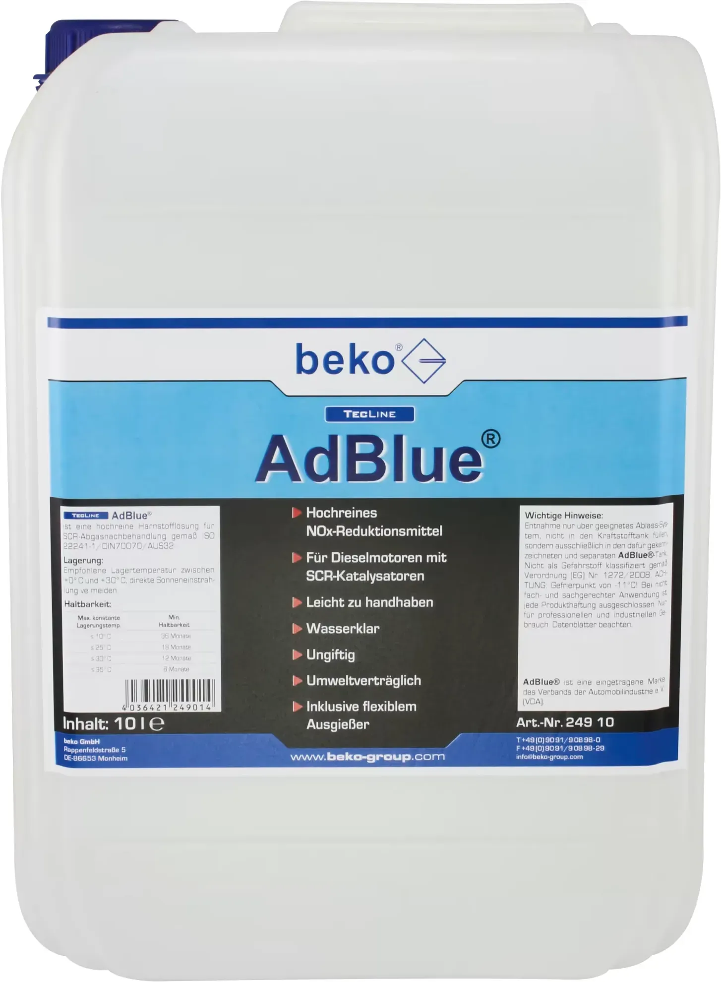 3 Händlerangebote bei billiger.de - Kategorie: Baumaterial - Beko - Hochreines NOx-Reduktionsmittel, für Dieselmotoren mit SCR-Katalysatoren, leicht zu handhaben, wasserklar, ungiftig, umweltverträglich, inklusive Ausgießer für alle gängigen Tanköffnungen.AdBlue ist korrosiv und muss in speziellen Gebinden bei empfohlenen Temperaturen von 0 C bis ca. +25 C gelagert werden.Unter +11 C wird das Produkt fest, kann jedoch nach dem Erwärmen weiterverwendet werden. Bei Temperaturen über +35 C beginnt die Zersetzung des Produktes und macht dies unbrauchbar. Daher sollten die Behälter auch nicht der direkten Sonneneinstrahlung ausgesetzt werden.VerarbeitungsvorteileKann in allen dieselbetriebenen Kraftfahrzeugen eingesetzt werden, die mit einer SCR-Abgasnachbehandlungseinrichtung (Selective Catalytic Reduction) ausgerüstet sind. AdBlue wird elektronisch gesteuert aus einem Zusatztank in das Abgas eingespritzt. Der Verbrauch beträgt ca. 4 6% des Dieselverbrauches, je nach Auslegung des SCR-Systems. - GTIN:4036421249014 Dieses MANNOL AdBlue ist mit 15.99 Euro ein solides Markenprodukt, das für LKW und PKW geeignet ist. ![]() ![]() 1 x 10L MANNOL AdBlue / Diesel LKW u. PKW SCR Harnstofflösung