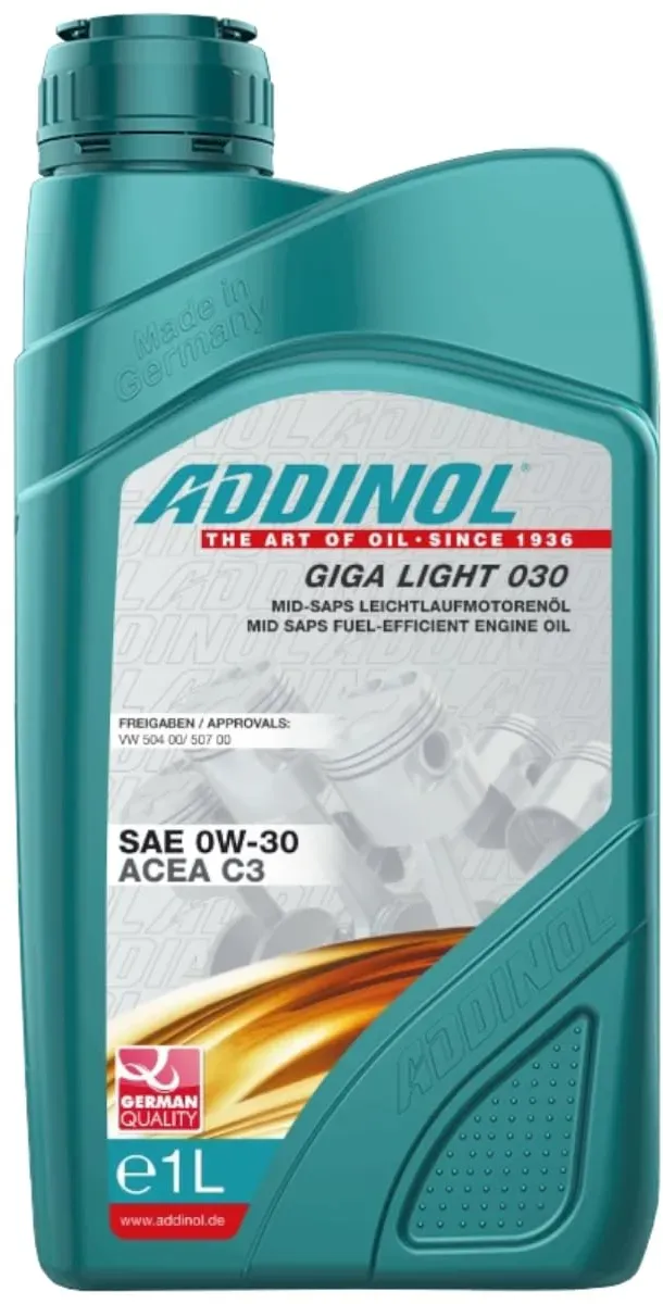 Kategorie: Motoröle - Addinol - GTIN:4014766075444 - Markenqualität - 9,99 Euro bei Amazon Marketplace Automotive - gefunden von billiger.de Ein 1-Liter-Angebot zu einem guten Literpreis, ideal für kleinere Mengen. ![]() ![]() 1 Liter - PE-Dose (1 eBay L = 17,73 €) Addinol Motoröl 0w30 Giga Light 030 VW Audi Seat