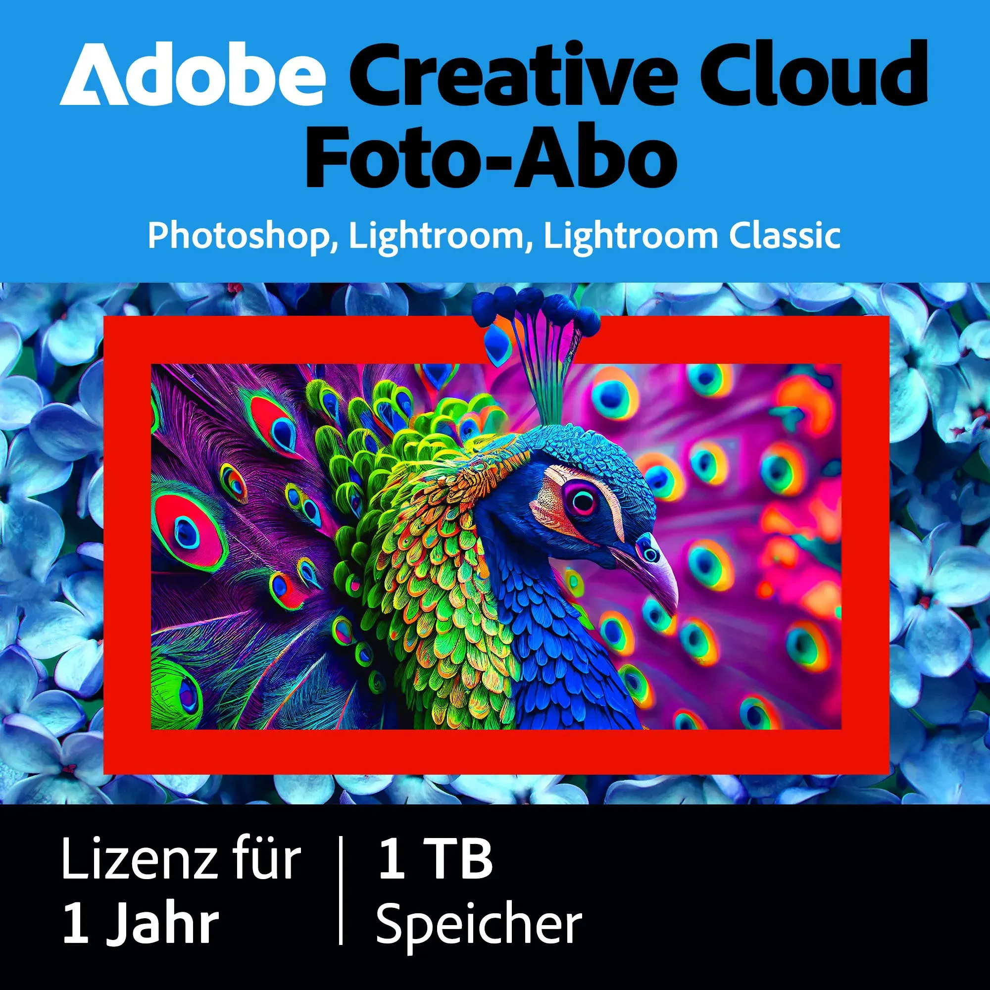 keine Angabe Jetzt als Download verfügbar.Adobe Creative Cloud Foto-Abo 1TB | inkl. Lightroom & Photoshop | 1 Jahr | KI-unterstützte Bildbearbeitung | WIN/MAC|Download | Aktivierungscode per Email