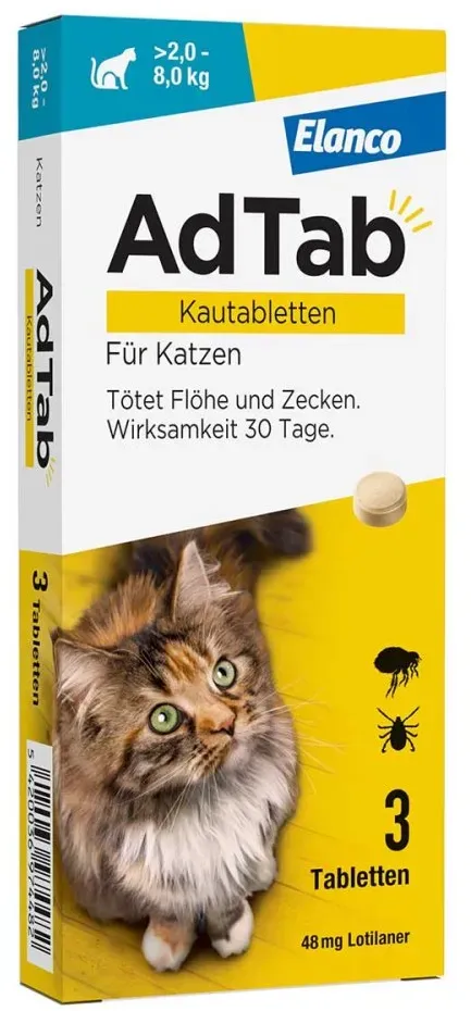 Adtab META PreisvergleichMit dem Meta-Preisvergleich suchen Sie gleichzeitig bei den großen Preisvergleich Portalen!Jetzt live Suche nach adtab starten! Adtab KaufberatungDer Begriff 'AdTab' bezieht sich hauptsächlich auf Kautabletten gegen Flöhe und Zecken für Katzen und Hunde. Diese Tabletten enthalten den Wirkstoff Lotilaner, der gezielt Insekten und Spinnentiere abtötet und eine Wirkdauer von etwa einem Monat hat. AdTab ist rezeptfrei, aber apothekenpflichtig und wird als schmackhafte Kautablette angeboten, die speziell für Katzen (ab 2 kg) und Hunde (je nach Gewichtsklasse) entwickelt wurde[1][3]. Wichtige Produktmerkmale bei AdTab sind:
