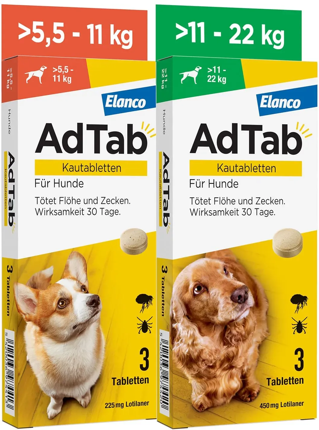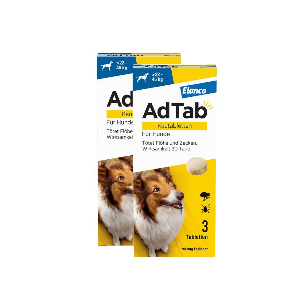 Zustand: Neu - 10,75 € / stück - Tabletten Flohpillen für Hunde - AdTab Elanco Deutschland GmbH - - - AdTab KAUTABLETTE: Da wir unsere Haustiere über alles lieben, ist effektiver Parasitenschutz ein MUSS. Mit AdTab für Hunde wird der Kampf gegen Zecken und Flöhe ganz einfach! MUSS MAN einfach lieben. Kann man EINFACH SCHÜTZEN. GUT VERTRÄGLICH: Da das Wohlbefinden Deines Hundes die höchste Priorität hat, haben wir AdTab in zahlreichen Studien getestet. Der Wirkstoff von AdTab, Lotilaner, hat sich als sehr gut verträglich und effektiv bewiesen. SCHNELLE WIRKUNG: AdTab Kautabletten töten Zecken und Flöhe innerhalb kurzer Zeit ab und schützen Deinen Hund einen ganzen Monat lang. EINFACH ZU VERABREICHEN: Dank ihrer Größe und des leckeren Rindfleischgeschmacks ist das Floh- und Zeckenmittel für Hunde mit oder nach dem Futter leicht zu verabreichen. LIEFERUMFANG: 1 Packung AdTab mit 3 Kautabletten gegen Zecken und Flöhe bei Hunden, für erwachsene Hunde und Welpen ab 8 Wochen mit einem Gewicht von über 5,5 bis 11 kg und eine Packung für Hunde ab 8 Wochen mit einem Gewicht von über 22 bis 45 kg. - Verkäufer: Bodfeld Apotheke im amazon.de Marketplace Dieses Kombi-Set ist ideal für Haushalte mit zwei Hunden unterschiedlicher Größe (5,5-11 kg & 11-22 kg) und bietet eine gute Preis-Leistungs-Option. ![]() ![]() Elanco AdTab Kombi-Set: Zecken- & Flohschutz für 2 Hunde in verschiedenen Größen (>5,5-11 kg & >11-22 kg), 2 Packungen mit je 3 Kautabletten, einfach zu verabreichen & schmackhaft