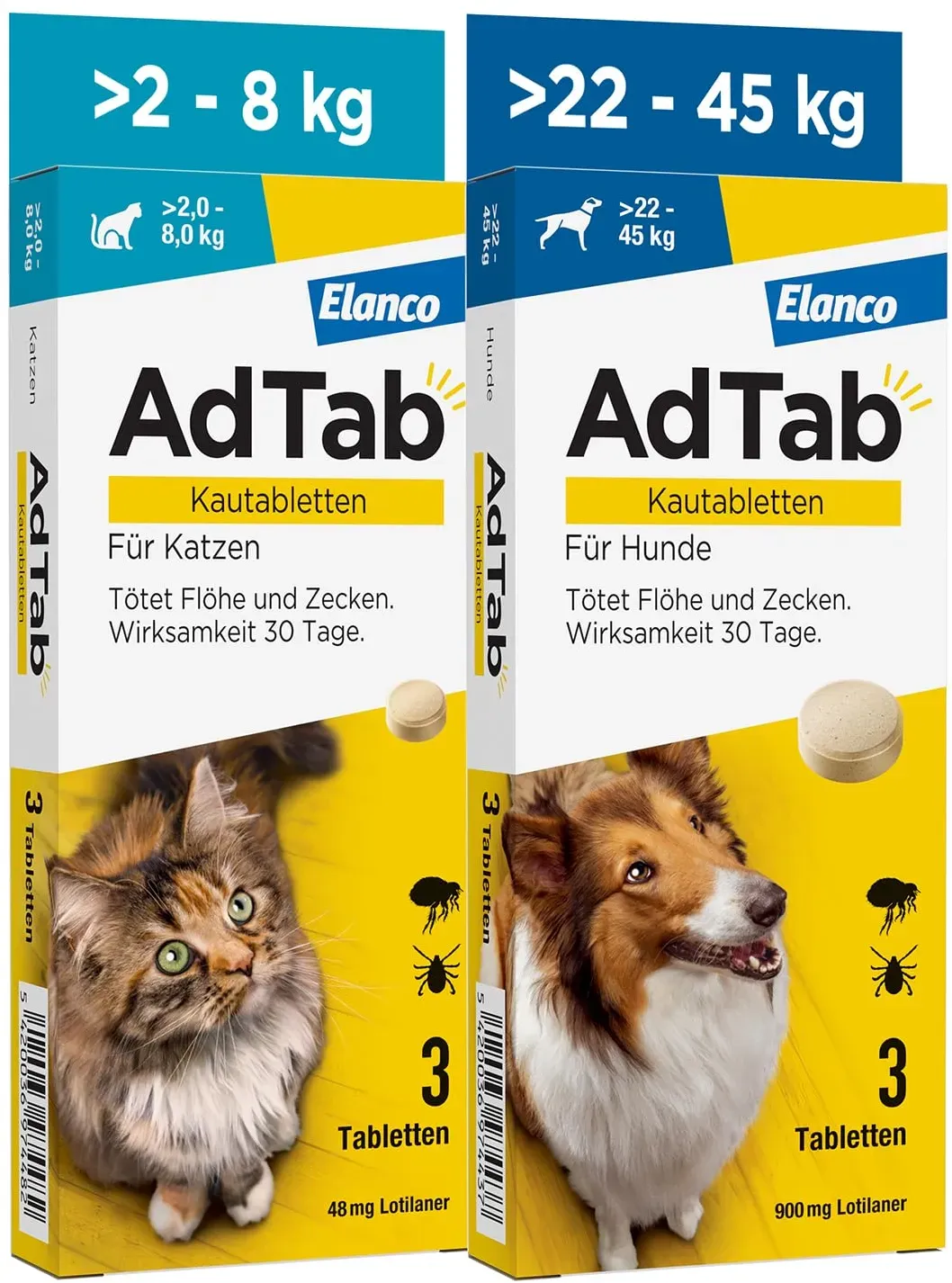 21 Händlerangebote bei billiger.de - Kategorie: Tiergesundheit - Elanco - Anwendungsgebiet von AdTab Hund 5,5 - 11 kg Kautablette gegen Zecken und FlöheEin Parasitenbefall ist nicht nur lästig, sondern kann auch Auslöser für unterschiedliche Symptome wie Rötungen und Juckreiz oder für Krankheiten sein. Durch verschiedene Umweltfaktoren und klimatische Veränderungen haben Flöhe und auch Zecken mittlerweile fast ganzjährig Saison.AdTabTM Kautabletten für Hunde über 5,5 bis 11 kg Körpergewicht sind ein orales Zeckenmittel in praktischer Tablettenform und ohne Rezept erhältlich. Sie bieten einen effektiven Zecken- und Flohschutz für den Hund für einen ganzen Monat.Flöhe und Zecken werden innerhalb von wenigen Stunden nach der Gabe für die Dauer von einem Monat rasch abgetötet. Dies verhindert eine Eiablage durch Flöhe. Der Vermehrungszyklus von Flöhen wird dadurch gestoppt und eine Kontamination der Umgebung reduziert.AdTabTM Kautabletten sind bereits für Welpen ab der 8. Lebenswoche und mindestens 1,3 kg Körpergewicht geeignet. Um vom kleinen Terrier ab 1,3 kg bis zum großen Schäferhund bis 45 kg das passende Produkt zu haben, gibt es AdTabTM für den Hund in insgesamt 5 unterschiedlichen Gewichtsklassen. Für die sehr großen Hunderassen über 45 kg empfiehlt sich, nach genauer Gewichtsermittlung, eine Kombination der Kautabletten entsprechend dem Körpergewicht des Hundes. Die Anwendung von AdTabTM ist besonders einfach: Die leckere Kautablette mit Rindfleischgeschmack ist klein ... Eine preiswerte Option für Katzenbesitzer, die einen effektiven Zecken- und Flohschutz für ihre Katze (2 - 8 kg) suchen. ![]() ![]() Elanco AdTab Katze 2 - 8 kg Kautablette gegen Zecken und Flöhe
