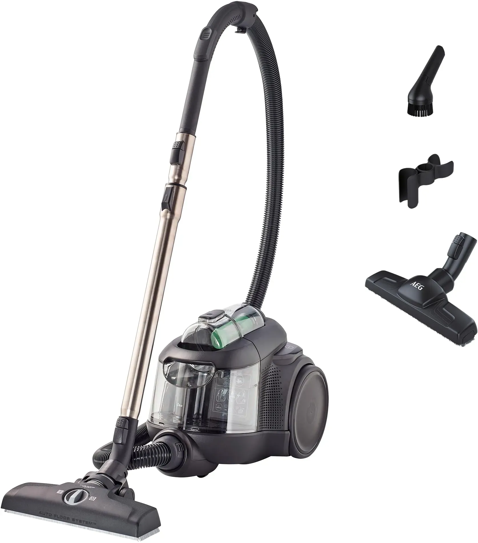 Gewöhnlich versandfertig in 2 bis 3 TagenAEG CLEAN 6000 öKO AL61C2öKO Staubsauger beutellos / 60% Recyclingmaterial / 550 W / Zusatzdüsen / Softräder / einfache Handhabung / 74 dB(A) / 12m Aktionsradius / 1,6 Liter Staubbehälter / Schwarz