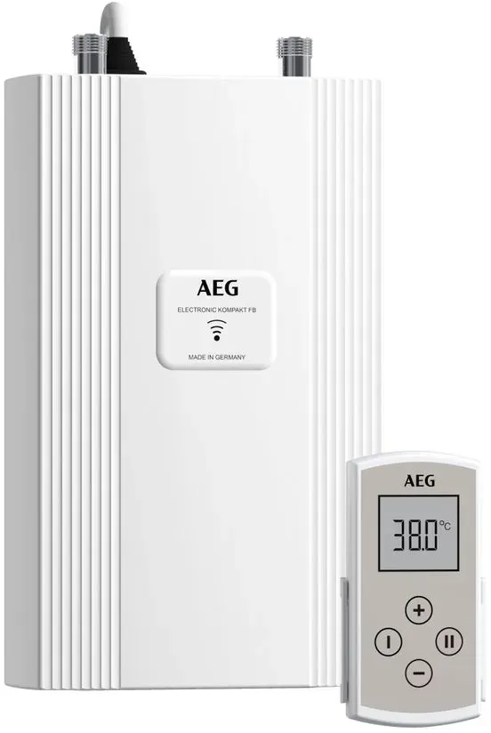 EEK: A - Kategorie: Durchlauferhitzer - AEG - GTIN:4041056030722 - AEG DDLE Compact OT 11/13 - Kompakte Warmwasserversorgung für Spüle Der elektronisch geregelte Durchlauferhitzer AEG DDLE Compact OT 11/13 bietet eine dezentrale Warmwasserversorgung. Das Gerät ist für die übertischmontage an Waschbecken, Ausgussbecken oder Küchenspülen konzipiert. Es ermöglicht eine zuverlässige, energieeffiziente und gradgenaue Warmwasserbereitung. PRODUKTVORTEILE - Kompaktes, flaches Design: Spart Platz und ermöglicht unauffällige Integration. - Hoher Komfort und Energieeffizienz: Elektronische Regelung für konstante Wunschtemperatur und Energieeinsparung. - Gradgenaue Wunschtemperatur: Ermöglicht eine präzise Temperatureinstellung bis zur Leistungsgrenze. - Mehrstufiges elektronisches Sicherheitskonzept: Gewährleistet einen sicheren Betrieb. - Serienmäßig mit Netzanschlusskabel: Vereinfacht die Installation. - Geeignet für die Küchenspüle: Wählbare Leistung (11 oder 13,5 kW) zur Anpassung an den Bedarf. - Stufenlose Temperaturwahl: Bequeme Einstellung über Drehwähler. - Geeignet zur Nacherwärmung: Ideal für den Einsatz mit Solar- oder Wärmepumpenanlagen. TECHNOLOGIE-DETAILS 3i-Technologie Die 3i-Technologie verwendet drei Sensoren, um die gewünschte Wassertemperatur präzise zu erreichen und konstant zu halten. Die manuelle Einstellung erfolgt über einen Drehregler am Gerät. Das Blankdraht-Heizsystem sorgt für eine schnelle Erwärmung des Wassers. Das System ermöglicht jederzeit warmes ... Für 282.99 Euro erhalten Sie einen Durchlauferhitzer mit praktischer Fernbedienung für die Untertischmontage. ![]() ![]() AEG elektronischer Kompakt-Durchlauferhitzer DDLE Kompakt FB 11/13 kW mit Fernbedienung für die Küche, Made in Germany, Festanschluss 400 V, solargeeignet, Untertischmontage, VDE geprüft,230769