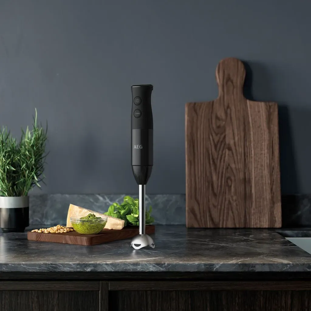 Auf Lager Versand durch AmazonAEG HB4-1-4GG Stabmixer / 2 Edelstahl-Klingen/inkl. Smoothie-Becher/BPA-frei / 2 Geschwindigkeitsstufen/Turbo-Funktion/spülmaschinenfest/gebürstetes Edelstahl/grau, Schwarz