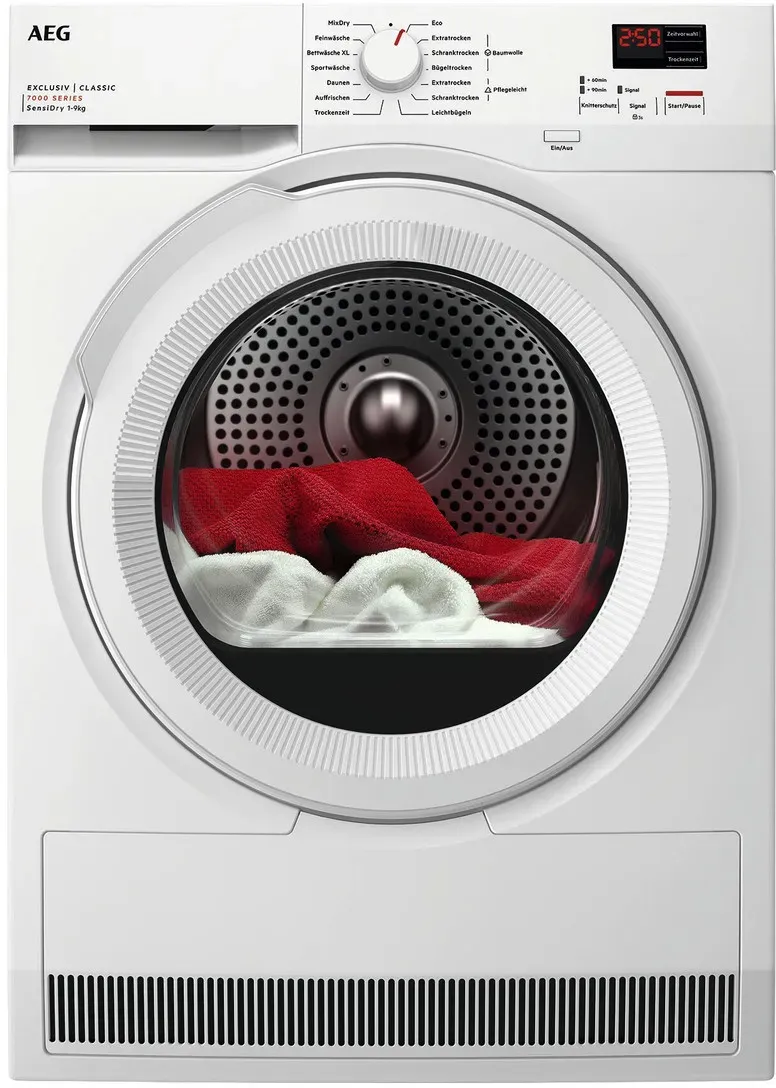 3 Händlerangebote bei billiger.de - EEK: C - Kategorie: Wärmepumpentrockner - AEG - WäSCHETROCKNER DER SERIE 7000 MIT SENSIDRY - Nutzt die Wärmepumpentechnologie, um bei halber Temperatur außergewöhnlich gleichmäßige Trockenergebnisse zu erzielen - Bewahrt deine Textilien vor unnötiger Hitze, für eine deutlich längere Haltbarkeit deiner Lieblingsstücke SPART ZEIT UND ENERGIE - Die ProSense Mengenautomatik sorgt für schonendes und zuverlässiges Trocknen Ihrer Lieblingskleidungsstücke. Innovative Sensoren passen den benötigten Zeitaufwand und Energieverbrauch automatisch an die Beladung an LEICHT ZU REINIGEN - EasyClean Filter ist ein effizientes Filtersystem, das besonders leicht zu reinigen ist. Das rt freie Luftwege und sorgt für eine gleichmäßige Trockenleistung bei konstant niedrigem Energieverbrauch KEIN VORSORTIEREN - MixDry trocknet deine Kleidungsstücke aus Synthetik und Baumwolle sorgfältig, gleichmäßig und mit der exakt richtigen Temperatur nicht zu trocken, nicht zu feucht. Exakte Maß an Temperatur und spart dabei noch Energie ENTFERNT 99,99 % DER BAKTERIEN UND VIREN - Das von Swissatest zertifizierte Hygiene-Programm reduziert die in der Wäsche vorhandenen Bakterien und Viren um über 99,99%. Die Temperatur wird für einige Minuten auf über 60 C gehalten und ein zusätzlicher Spülgang sorgt dafür, dass Allergene entfernt werden - GTIN:7333394062525 ![]() ![]() AEG Serie 7000 TR7TC86 Wärmepumpentrockner (8 kg)