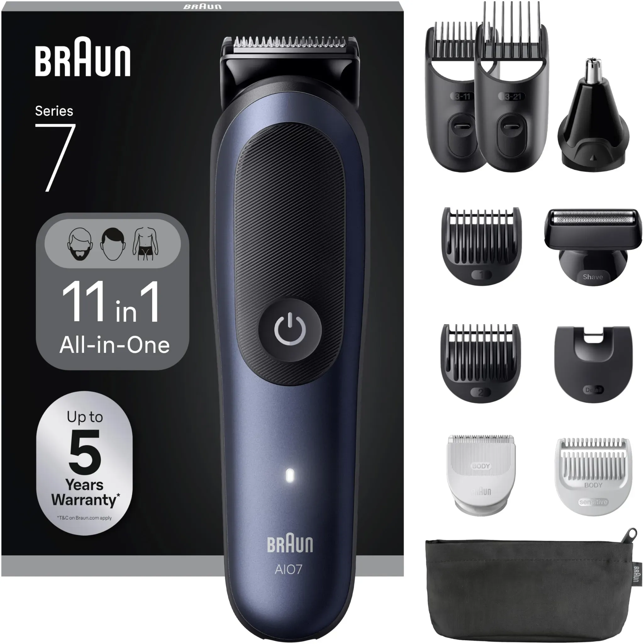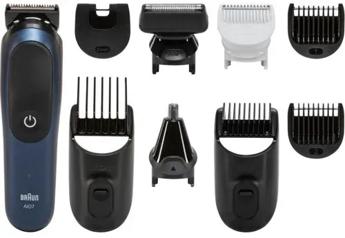 keine Angabe Versand durch AmazonBraun All-in-One Trimmer-Set 7, 11-in-1 Multigroom, Barttrimmer, Nasenhaartrimmer, Haarschneidemaschine für Gesicht, Kopf und Körper, 120 Min Akku, 14 Längen (3?21 mm), Wasserdicht, AIO7540, Blau