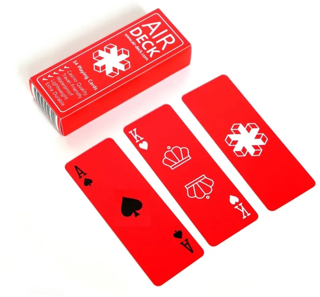 Kategorie: Gesellschaftsspiele - Air Deck - GTIN:4255649952920 - ULTRALEICHTES DESIGN: Die Air Deck Spielkarten wurden speziell für Reisende und Outdoor-Enthusiasten entwickelt. Dank ihres leichten Gesamtgewichts von nur 75g inklusive Schachtel und 54 Spielkarten, passen sie in jede Tasche. WASSERFEST & STRAPAZIERFäHIG: Genießen Sie dieses Kartenspiel an jedem Ort diese Karten sind vollständig wasserfest und strapazierfähig. Ob Strand, Camping oder auf Reisen, diese Karten sind immer spielbar. HOCHWERTIG & KOMPAKT: Mit einer optimierten Größe, die den perfekten Kompromiss zwischen Spielbarkeit und Kompaktheit bietet, sind diese Karten ideal für unterwegs. DAS PERFEKTE GESCHENK: Diese Air Deck Spielkarten kommen in einem modernen Design, das sowohl klassische als auch innovative Spielelemente vereint. Ideal für Spielabende, als Geschenk oder als trendiges Reiseaccessoire., Hersteller: Tip Top Things Ltd - 14,50 Euro bei Amazon Marketplace Toys - gefunden von billiger.de Das Minimal Red Air Deck bietet eine dezente, aber dennoch stilvolle Variante für alle, die ein klassisches Rot in einem minimalistischen Design wünschen. ![]() ![]() Air Deck - Leichte und kompakte Spielkarten für die Reise - 54 Karten, Kartenspiel Urlaub, Kartendeck (Minimal Red)