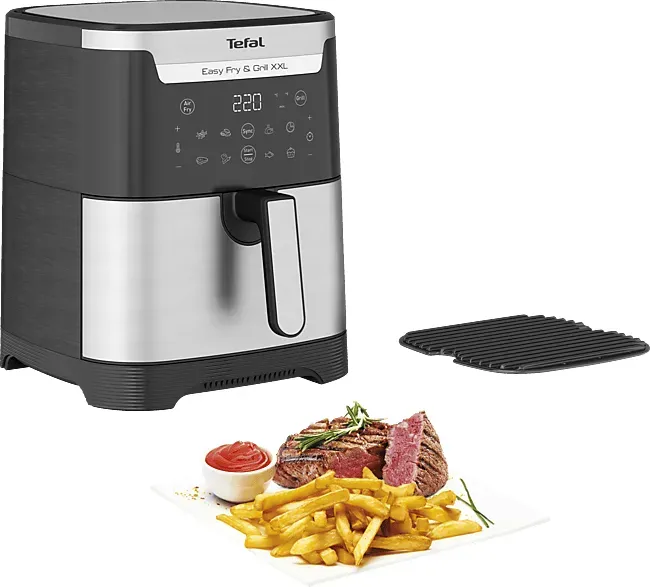 Zustand: Gebraucht - Heißluftfritteusen - Russell Hobbs - 27632-56 - EAN: 5038061171150 - IDEAL FÜR FAMILIEN - Der Airfryer hat eine Leistung von 1800 Watt und einen Temperaturbereich von 40-200° C. Mit einem großzügigen 8,3-Liter-Fassungsvermögen und der innovativen Rapid-Air-Technologie wird gesund gekocht mit wenig oder keinem Öl und sparst dabei bis zu 53 % Energie*. ( *Im Vergleich zu einem konventionellen Backofen) VIELSEITIGES KOCHEN - Die digitale Touchscreen-Bedienung und 9 voreingestellte Programme erleichtern die Zubereitung von Pommes Frites, Steaks, Fisch, Gemüse, Hühnchen, Pizza, Backen, Dörren und Aufwärmen. SCHLANKES UND STILVOLLES DESIGN - Das neue Design der Russell Hobbs Satisfry Heißluftfritteuse mit trendigen Silbernen-Akzenten und einem schwarzen, strukturierten Gehäuse macht sie zu einem echten Hingucker in jeder Küche. ERINNERUNG ZUM WENDEN DES GARGUTES UND AUTOMATISCHE ABSCHALTUNG - Der Signalton nach der Hälfte der Garzeit erinnert daran das Gargut zu wenden um ein gleichmäßiges Ergebniss zu erzielen. Die automatische Abschaltung sorgt für Sicherheit, indem sie die Heißluftfritteuse nach dem Kochen oder beim Entfernen des Korbs ausschaltet. SPÜLMASCHINENGEEIGNET - Dank der langlebigen, leicht zu reinigenden Antihaftbeschichtung sind die keramikbeschichtete Grill-Platte und der Korb ganz einfach in der Spülmaschine oder von Hand zu reinigen. Alle Teile, die mit Lebensmitteln in Berührung kommen, sind BPA-frei. - 56 Händler im amazon.de Marketplace Ein preisgünstiges Angebot für den Tefal Easy Fry & Grill XXL, ideal für preisbewusste Käufer, die dennoch eine gute Leistung wünschen. ![]() ![]() Tefal Easy Fry & Grill XXL EY801D silber