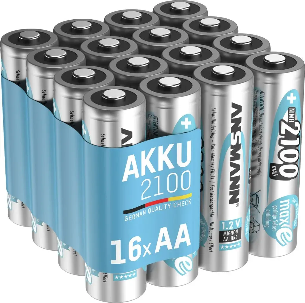5 Händlerangebote bei billiger.de - Kategorie: Batterien & Akkus - Ansmann - Dank der maxE-Technologie ist die Selbstentladung in den Akkus 10-mal geringer als in gewöhnlichen NiMH-Akkus / Nach einem Jahr stehen noch einzigartige 80% der Anfangskapazität zur Verfügung Bares Geld sparen: die Akkus sind bis zu 1000 Mal wiederaufladbar & überzeugen mit konstanter Leistungsabgabe bei geringer Selbstentladung - überall wo sonst Einwegbatterien zum Einsatz kommen Umweltfreundlich: Die Schnellladeakkus sind schwermetallfrei & bestechen durch eine besonders hohe Zyklenfestigkeit die Langlebigkeit rt / Kälte- & Hitzebeständigkeit für längeren Halt Langlebig & sicher: Die bereits vorgeladenen Akkus sind schnellladefähig & gegen Tiefenentladung & überladung geschützt / Auch bei mehrmaligen Teilaufladungen zeigt sich kein Memory-Effekt Lieferumfang: 8x Ansmann NiMH Mignon AA Akkus 1,2 Volt / Typ 2100 mAh / Vorgeladene Hochleistungsakkus mit Langlebigkeit / Bis zu 1000 Mal wiederaufladbar - GTIN:4013674033362 Dieser Varta 16er-Pack ist ideal für Nutzer mit vielen Geräten, die AA-Akkus benötigen, und bietet ein gutes Preis-Leistungs-Verhältnis pro Akku. ![]() ![]() Varta Batterien AA, wiederaufladbar, 16 Stück, Akku, Power on Demand, 2100 mAh Ni-MH, vorgeladen, sofort einsatzbereit [Exklusiv bei Amazon]