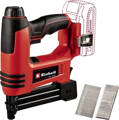 Kategorie: Elektrotacker - Einhell - GTIN:4006825653786 - Der Einhell Akku-Nagler TE-CN 18 Li - Solo ist ein ideales Werkzeug für Garage, Werkstatt und Bastelstube sowie für Sanierungs- und Renovierungsarbeiten. Objekte mit Klammern oder Nägeln fixieren, das geht mit der Kombination aus Tacker und Nagelpistole schnell von der Hand. Das robuste Getriebe ermöglicht bis zu 20 Einschläge pro Minute, die Tiefeneinstellung sorgt für eine variable Einschlagtiefe. Das nahe Arbeiten an den Kanten ist durch die schlanke Tackernase möglich. Das Magazin ist mit einer Füllstandsanzeige ausgestattet und gewährt einen stetigen überblick über die aktuelle Ladung. Der Druckmechanismus an der Tackernase ermöglicht sicheres Arbeiten, während die großzügigen Softgrip-Flächen einen bequemen und festen Halt bieten. Die Lieferung erfolgt inklusive praktischem Gürtelclip zur sicheren Aufbewahrung sowie inklusive 300 Nägeln (32 mm) und 300 Klammern (19 mm). Akku und Ladegerät der Power X-Change-Reihe sind separat erhältlich, zum Beispiel als praktisches Starter-Set. # Einhell Power X-Change 18V kabellose Freiheit mit nur einem Akku Dieser Artikel ist Teil des Einhell Power X-Change 18V Akkusystems. Das System erlaubt es, mehr als 300 Akku-Geräte , ob Elektrowerkzeuge oder Gartengeräte, mit ein und demselben Akku zu betreiben. Vom allseits bekannten Akkuschrauber über die Stichsäge bis hin zum Rasenmäher ist mittlerweile eine Vielzahl an Werkzeugen als kabelfreie Akkuvariante verfügbar. Die ... Der Einhell TE-CN 18 Li Solo ist ein beliebtes Kombigerät, das sowohl tackern als auch nageln kann und somit vielseitig einsetzbar ist. ![]() ![]() Einhell, Tacker + Nagelpistole, TE-CN 18 Li Solo