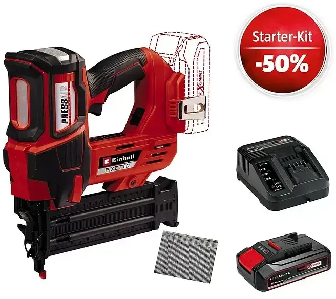 22 Händlerangebote bei billiger.de - Kategorie: Elektrotacker - Einhell - Power X-Change - Der Einhell Akku-Tacker FIXETTO 18/38 S ist Teil der Power X-Change Familie, in der Akkus, Ladegeräte und Geräte flexibel kombiniert werden. Schussregler - Der Akku-Tacker mit wartungsfreier PressAir-Technology ist mit einem Schussregler zur Wahl zwischen Einzel- oder Serienschuss ausgestattet. Tiefeneinstellung - Das robuste Getriebe ermöglicht bis zu 60 Einschläge pro Minute. Für exakte Ergebnisse kann die Einschlagtiefe per Tiefeneinstellung reguliert werden. Großes Magazin - In das große Magazin mit praktischer Füllstandsanzeige passen bis zu 100 Klammern. Per Knopfdruck lässt es sich einfach öffnen und nachfüllen. Handhabung - Der Tacker liegt dank Softgrip angenehm in der Hand. Die Sicherheitsnase schützt vor ungewolltem Auslösen und zwei LEDs bieten stets optimale Sicht. Inkl. Klammern - Der Akku-Tacker kann mit 10 - 38 mm langen und 5,7 mm breiten Klammern verwendet werden. In der Lieferung sind bereits 500 Klammern enthalten. Lieferung ohne Akku - Der Einhell Akku-Tacker FIXETTO 18/38 S wird ohne Power X-Change Akkus und ohne Ladegerät geliefert. Diese sind separat erhältlich. - GTIN:4006825668483 Der Einhell Akku-Nagler FIXETTO 18/50 N ist ein leistungsstarkes Gerät für längere Nägel und anspruchsvolle Befestigungen. ![]() ![]() Einhell Akku-Nagler FIXETTO 18/50 N