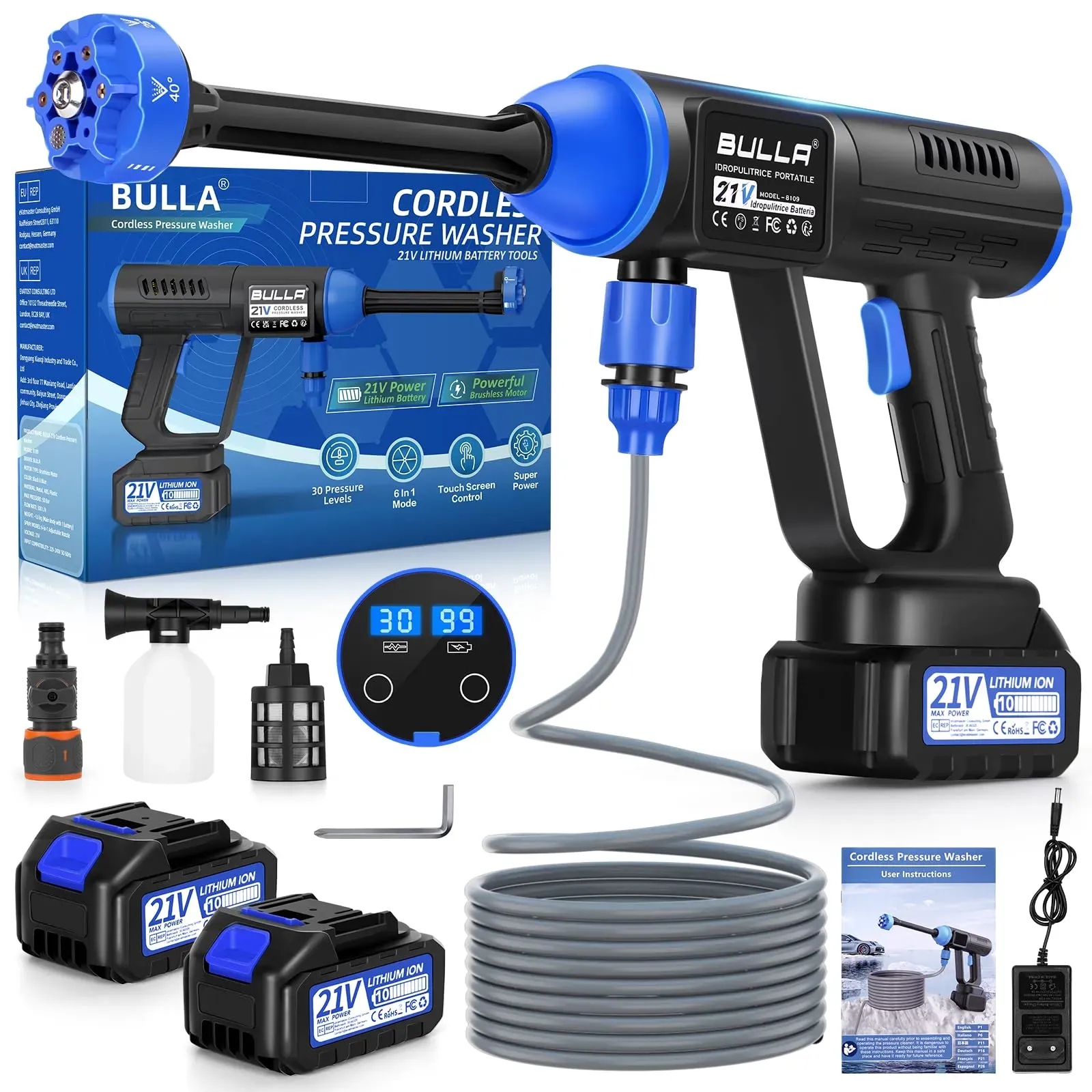 Verfügbarkeit: Auf Lager - Kategorie: Hochdruckreiniger - litglobe - 🔫ÂStarke Leistung, effiziente Reinigung: Akku Hochdruckreiniger ist mit einem hocheffizienten bürstenlosen Motor ausgestattet, der einen maximalen Druck von bis zu 120 Bar und eine hohe Durchflussrate von 3,4 GPM bei einer Sprühdistanz von bis zu 12 Metern liefert. Dank seiner hervorragenden Leistung entfernt der Hochdruckreiniger Akku mühelos, effizient und schnell alle Arten von hartnäckigem Schmutz, egal ob Auto, Gartenboden oder Gartenmöbel. š¡Â6-in-1-Multifunktionsdüse: Akku Hochdruckreiniger ist mit einer verstellbaren 6-in-1-Multifunktionsdüse mit 0°, 15°, 25°, 40°, Sprühmodus und Schaummodus ausgestattet. Durch einfaches Drehen können Sie problemlos zwischen 6 verschiedenen Sprühmodi wechseln, um Ihren unterschiedlichen Anforderungen gerecht zu werden €“ von der Feinreinigung bis zur großflächigen Reinigung. Die mitgelieferte Schaumsprühflasche erzeugt effektiv reichhaltigen Schaum für eine gründlichere Reinigung. 💦ÂDrei-Stufen-Steuerung: Hochdruckreiniger Akku verfügt über eine Drei-Stufen-Steuerung, die die Reinigungsintensität durch Anpassung des Wasserdurchflusses verändert: Die erste Stufe eignet sich für die Reinigung empfindlicher Oberflächen wie Haushaltsglas. Die zweite Stufe eignet sich hervorragend für die Reinigung großer Flächen und Zäune. Die dritte Stufe entfernt kraftvoll hartnäckigen Schmutz und eignet sich besonders für ... Für unter 70 Euro bietet dieser Akku-Druckreiniger mit 6-in-1 Düse und zwei Akkus eine gute Vielseitigkeit für Balkon- und Autowäsche. ![]() ![]() Bulla Akku Hochdruckreiniger, Hydro Blast, Akku Druckreiniger mit 6-In-1, Mobiler Hochdruckreiniger mit 2 Akku für die Balkon- und Autowäsche, Terrasse