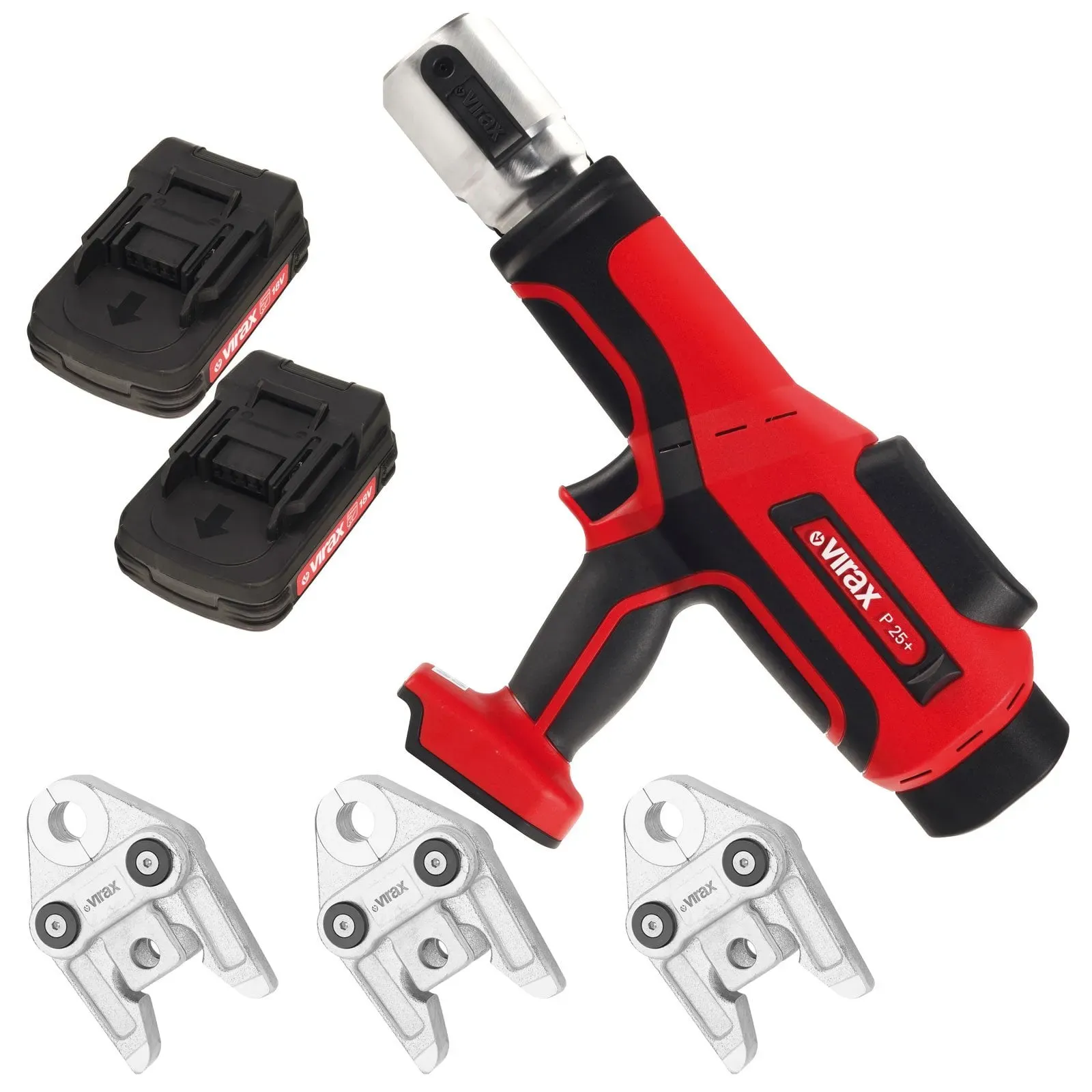 Verfügbarkeit: sofort lieferbar, 1-3 Tage in DE - Kategorie: Sonstiges Elektrowerkzeug - Rems - GTIN:4059915069394 - REMS Mini-Press ACC Pressmaschinen-Set - 8-teilig Universelles, handliches Elektrowerkzeug mit Zwangsablauf zur Herstellung von Radial-Pressverbindungen (bis Ø 40 mm) aller gängigen Pressfittings-Systeme. Pressvorgang im Tippbetrieb mit ACC - A utomatic C ercuit C ontrol Für Arbeitssicherheit, Funktionssicherheit und Betriebssicherheit. Automatischer Rücklauf nach vollendetem Pressvorgang (Zwangsablauf). Eigenschaften und Details: superleicht, superklein, superhandlich Antriebsmaschine mit Akku nur 2,4 kg Maschine mit Presszange nur 33 cm lang überall einsetzbar, frei Hand, über Kopf, an besonders engen Stellen optimale Gewichtsverteilung für Einhand-Bedienung ergonomisch gestaltetes Gehäuse integrierte LED-Arbeitsleuchte zur Beleuchtung der Arbeitsstelle drehbare Presszangenaufnahme sicherer Sitz der Presszange/Zwischenzange durch automatische Verriegelung nur mit REMS Presszangen Mini zu verwenden Antrieb: tonnenschwere Schub- und Presskraft für sekundenschnelles, einwandfreies Pressen Schubkraft 22 kN leistungsstarker elektrohydraulischer Antrieb mit durchzugstarkem Akku-Motor 14,4 V, 380 W Abgabe inkl. robustem Planetengetriebe, Exzenterkolbenpumpe und kompaktem Hochleistungs-Hydrauliksystem Sicherheits-Tippschalter Akku- oder Netzbetrieb: Li-Ion PLUS Technology Hochbelastbarer Akku Li-Ion 14,4 V mit 2,5 Ah Kapazität Zusätzlicher Akku Li-Ion ... Die VIRAX Akku-Pressmaschine VIPER P25+ ist ein robustes und leistungsstarkes Gerät mit Presszangen und VIRABOX, ideal für den intensiven Gebrauch. ![]() ![]() VIRAX Akku-Pressmaschine VIPER P25+ 18V / 2x 1,5 Ah Akku + Ladegerät inkl. Presszangen V15/V22/V28 in VIRABOX