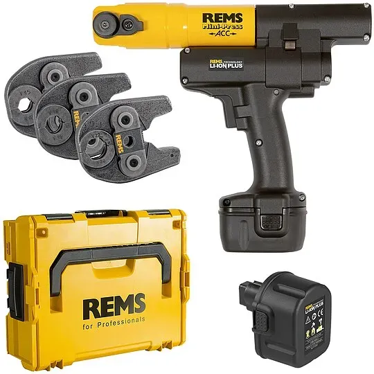 Zustand: Neu - Einpresswerkzeuge - Rothenberger ROTHENBERGER Werkzeuge GmbH - 1000004173 - EAN: 4004625552063 - Die ROMAX 4000 AMPShare verpresst Fittings aus Metall, Kunststoff und Mehrschichtverbundsystemen (MSR) bis zu 110 mm und ist ideal für professionelle Installationen. Das Set enthält Pressbacken der Kontur SV in den Größen 15-22-28 mm, für vielseitige Anwendungen bei verschiedenen Rohrdurchmessern und Systemen. Mit einer Kolbenkraft von 32-34 kN und einem schnellen Presszyklus von nur 5 Sekunden sorgt die ROMAX 4000 für effiziente und zeitsparende Arbeitsprozesse. Das geringe Gewicht von nur 3,6 kg und die ausgewogene Gewichtsverteilung ermöglichen ergonomisches und ermüdungsfreies Arbeiten, selbst bei langen Einsätzen. Dank des verlängerten Serviceintervalls von 40.000 Presszyklen oder n wird eine hohe Produktivität und lange Lebensdauer gewährleistet. - bei Amazon.de Die REMS Akku-Press ACC Basic-Pack im Systemkoffer L-Boxx ist eine hochwertige und universell einsetzbare Presszange für professionelle Anwender. Contorion. de