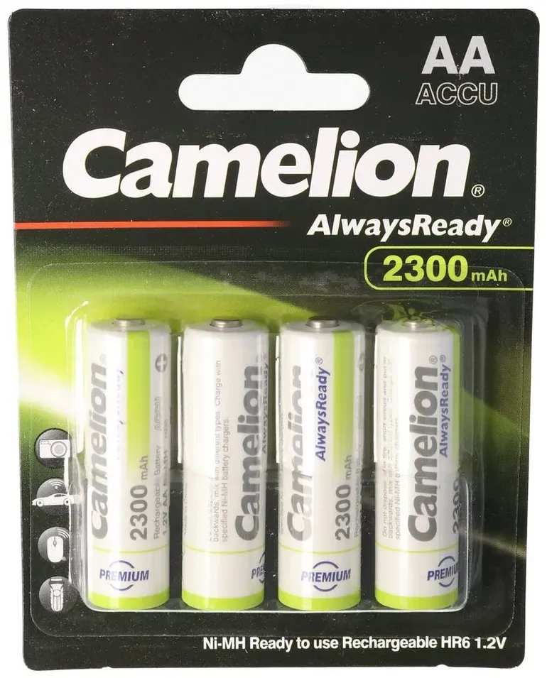 Kategorie: Batterien & Akkus - Camelion - GTIN:4260216455667 - Technische Daten Kapazität , 800 mAh, Spannung , 1,2 V, Technologie , NiMH - Nickel-Metallhydrid, Batterie-/Akku-Technologie , NiMH - Nickel-Metallhydrid, Maße & Gewicht Gewicht , 120.0000 g, - 11,75 Euro bei OTTO - gefunden von billiger.de ![]() ![]() Camelion AA, Mignon LR6, HR6, NiMH Akku mit bis zu 2300mAh in 4er Blisterverpackung, Always Ready mit geringer Selbstentladung, Ready to Use Akku