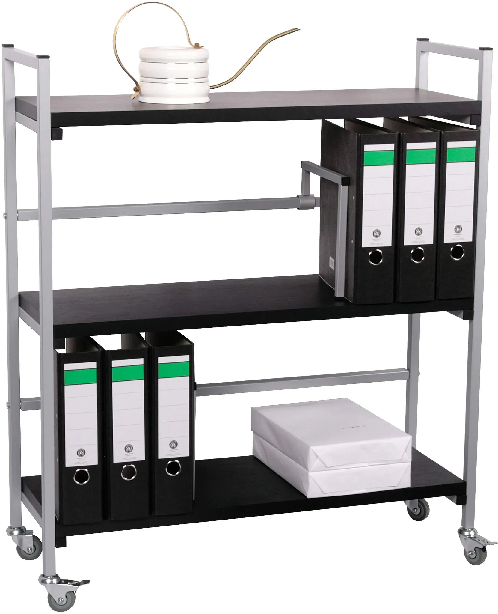 Verfügbarkeit: Auf Lager - Kategorie: Büroschränke - bümö - GTIN:4066174094890 - Aktenwagen Maße: Höhe 72 cm | Breite: 73,5 cm | Tiefe: 40 cm Bietet Platz für Aktenordner, Ablagen, Papier & Büromaterial Stabile Stahlkonstruktion einbrennlackiert | Böden aus melaminharzbeschichteter Spanplatte Leichtgängige Laufrollen Top-Markenqualität für den professionellen Einsatz - 168,63 Euro bei Amazon Marketplace Home - gefunden von billiger.de Ein solider Rollwagen mit drei Böden und zwei Ordnerhaltern, der ein gutes Preis-Leistungs-Verhältnis für die Ordneraufbewahrung bietet. ![]() ![]() Rollregal/Ordner-Rollwagen HxBxT: 100x89x30cm, 3 Böden, schwarz inkl. 2 Ordnerhalter, Made in Germany (Marke: Szagato) (Ordnerrollwagen, Ordnerregal, Büroregal, Bürowagen, Aktenwagen, Rolltisch)