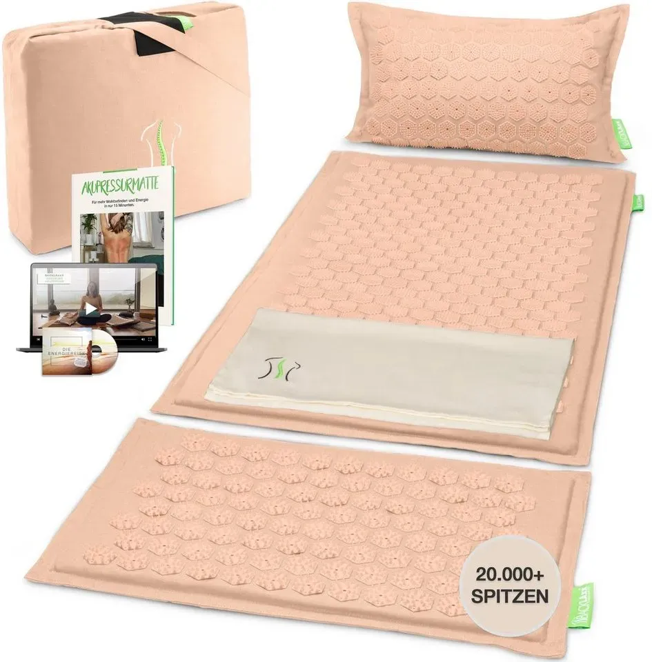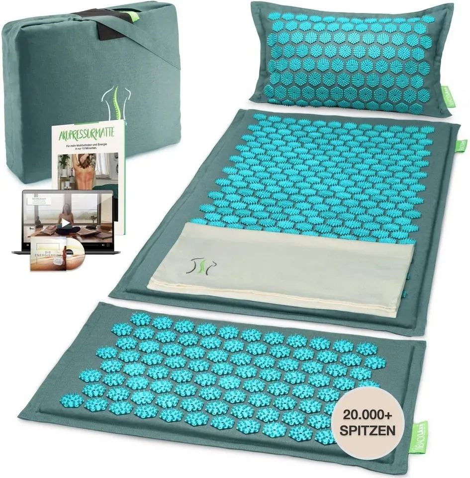 Preisbereich und MarktpositionAkupressurmatten bewegen sich generell in einem Preisbereich zwischen 25 und 100 Euro[2]. Experten empfehlen, sich an Modellen zwischen 40 und 80 Euro zu orientieren, die neben der Matte zusätzliches Zubehör wie Massagebälle enthalten[2]. Das BACKLAxx Magnum Set liegt mit einer unverbindlichen Preisempfehlung von etwa 87 Euro im oberen Preissegment[8]. Für diesen Preis erhalten Sie jedoch einen umfangreichen Lieferumfang und hochwertige Verarbeitung, was das Preis-Leistungs-Verhältnis rechtfertigt[8]. Beliebte ProduktmerkmaleBei der Auswahl einer Akupressurmatte sollten Sie folgende Kriterien beachten[6]: Noppenanzahl Die Anzahl der Noppen beeinflusst die Intensität der Stimulation. Mehr Noppen bedeuten intensivere Massage, während weniger Noppen sanftere Stimulation bieten. Das Magnum Set mit über 20.000 Spitzen gehört zu den intensiveren Varianten. Materialqualität Hochwertige, schadstofffreie Materialien sind entscheidend. Das BACKLAxx Set verwendet natürliche Kokosfasern und medizinisch geeignete Kunststoffe. Größe der Matte Die Größe sollte zu Ihrer Körpergröße passen. Das Magnum Set ist speziell für größere Menschen konzipiert und bietet mit 100 x 52 cm eine besonders großzügige Liegefläche[1]. Wirkungsweise und AnwendungDie regelmäßige Anwendung von nur 15 Minuten auf der Akupressurmatte kann verschiedene positive Effekte haben[1]: