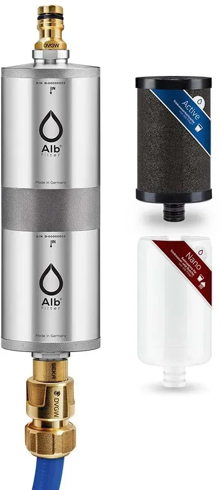 Kategorie: Wasseraufbereitung - Alb Filter - GTIN:4260590613578 - Alb Connect Active und Nano Doppelstufen Trinkwasserfilter. Kokos Blockaktivkohle in Verbindung mit gebündelten Hochleistungsmembranen. Made in Germany Filtration von Chlor, organischen Schadstoffen und Schwermetallen. Verbesserung von Geruch, Geschmack und Farbe. Reduktion von medikamentösen Rückständen, Hormonen uvm. Wirksamer Schutz vor Keimen und Krankheitserregern ( ~99,99% ) E. coli Bakterien, Vibrio Cholerae, Shigellen, Salmonellen uvm. Mobiler Einsatz: Mit praktischem Gardena Schlauchanschluss, Hahnverbinder und Schlauch. DVWG zertifiziert und lebensmittelecht. Trinkwasser-Filter für Boot, Yacht, Schiff, Camping, Wohnwagen und Wohnmobil Schnelle und variable Befüllung von Tank, Kanister und Wasserbehälter aus externen Wasserstellen. 100% Natürliche Filtermaterialien, Made in Germany - 299,90 Euro bei Amazon Marketplace Automotive - gefunden von billiger.de Das Mobil Gardena Anschluss-Set in Titan ist eine Premium-Option, die Langlebigkeit und ein ansprechendes Design vereint. ![]() ![]() Alb Filter FUSION Active+Nano Trinkwasserfilter gegen Schadstoffe und Keime | Mobil Gardena Anschluss-Set | Made in Germany - Titan