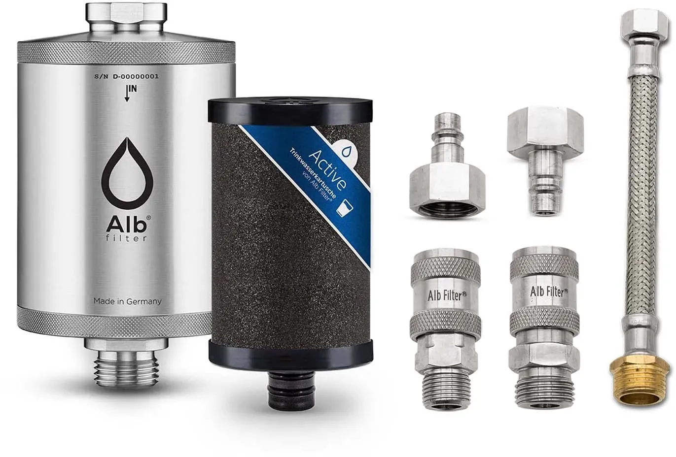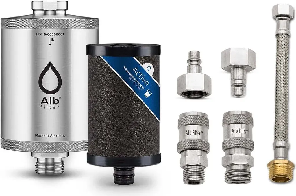 Kategorie: Wasserfilter - Alb Filter - GTIN:4260590616111 - Alb Filter Travel Active Trinkwasserfilter - Ausführung EDELSTAH L Einbauvariante (Travel) direkt nach dem Wassertank Die Versorgung mit Wasser gehört zu einer der wichtigsten Aufgaben, wenn Sie als Reisender z.B. mit dem Camper oder Boot unterwegs sind. Mit dem Travel Adapter-Set kann das Alb Filtergehäuse inkl. Trinkwasserfilterkartusche leicht zwischen oder an die Trinkwasserversorgung Ihres Wohnmobils adaptiert werden. Der Einbau erfolgt meist direkt nach dem Wassertank (d.h. in der Druckstufe nach der Wasserpumpe) oder Unterspüle vor der Entnahmestelle (Armatur). Der Alb Trinkwasserfilter inklusive Anschluss-Set mehr benötigen Sie nicht, um den Alb Trink-Wasserfilter im Wohnmobil oder Camper installieren zu können. Entscheiden Sie über die passende Filtervariante für den gewünschten Einsatzzweck. Ausführung: Travel Active Travel Nano Schwerpunkt Active: Entnahme von schlechtem Geschmack und Gerüchen Hochwertige Alb Filter Kokosnuss Blockaktivkohle adsorbiert lästige Gerüche (Chlor, CKW's, FCKW's uvm.) und Geschmacksbeeinträchtigungen im Trinkwasser. Reduzierung von Schwermetallen: Die adsorbierende Wirkung der Aktivkohle bindet Schwermetalle wie etwa Blei und Kupfer im Trinkwasser. Filtrierung von Mikroplastik Durch die ultrafeine Struktur der gesinterten Aktivkohle werden mikroskopisch kleine Plastikteilchen zuverlässig zurückgehalten. Reduzierung von Pestiziden und Arzneimittelrückständen Organische ... Der TRAVEL Active Trinkwasserfilter mit Anschluss-Set ist eine zuverlässige Lösung für Camping und Wohnwagen, Made in Germany. ![]() ![]() Alb Filter® TRAVEL Active Trinkwasserfilter mit Anschluss-Set für Camping, Wohnwagen und Caravan. Qualität Made in Germany (Edelstahl)
