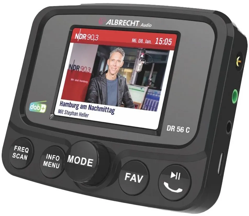 Autoradio Werkzeug Elektrowerkzeuge Baustellenradios Unterhaltungssysteme im Auto - EAN:4032661271563 - Überblick Mit Vollbild Farbdisplay Aktive DAB+ Folienantenne für bestmöglichen Empfang Freisprecheinrichtung und Musik-Streaming für Smartphones Beschreibung Der Albrecht DR 56 C von Albrecht Audio ist der erste Digitalradio Adapter für das Autoradio mit Vollbild Farbdisplay. Ganz einfach Ihr bestehendes Autoradio mit DAB+ Digitalradio nachrüsten: einfach den Adapter mit der beiliegenden Saugnapfhalterung an der Windschutzscheibe installieren, die Antenne verlegen und einen Sendersuchlauf starten. Schon steht dem digitalen Radiogenuss im Auto nichts mehr im Wege. Zusätzlich können Sie auch noch Ihr Smartphone mit dem Albrecht DR 56 C verbinden und dann Telefonanrufe entgegen nehmen oder Musik von Ihrem Smartphone über das Autoradio abspielen Eigenschaften 6.1 cm (2.4 Zoll) TFT Farbdisplay mit 6 Zeilen und Hintergrundbeleuchtung · DAB Slideshow im Vollbild · Tastenbeleuchtung abschaltbar · FM Transmitter für kabellose Übertragung zum Autoradio · MP3 Player über Micro SD Karte · Autom. - gefunden von Kelkoo ![]() ![]() ALBRECHT DR56C - Digitalradio Autoradio Adapter
