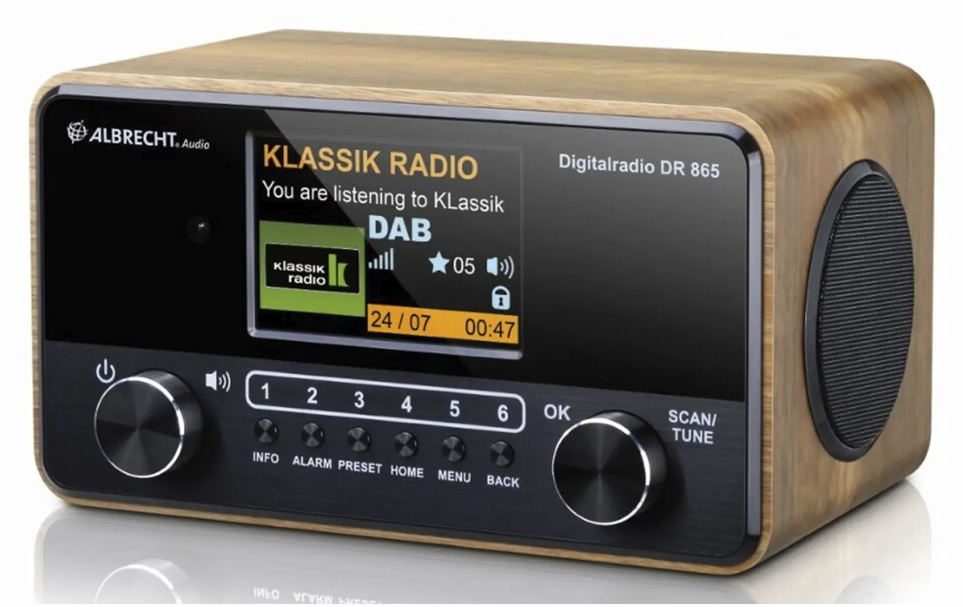 Albrecht - EAN: 4032661278654 - Albrecht DR 865 Digitalradio, DAB+/UKW/Bluetooth, 4'-TFT-Farbdisplay, Retro-Stil Das DAB+ Radio DR 865 im edlen Retro-Stil mit massiven Holzgehäuse bietet Radiovergnügen auf höchstem Niveau. Aufgrund seiner schlichten und zugleich modernen Optik passt es ideal in verschiedenste Wohnumgebungen. Dank des Seniorenmodus bietet das Radio eine leichte Bedienung: es befinden sich lediglich der Ein-/Ausschalter, Lautstärkeregelung und die 6 Sendertasten am Radio. Eine Tastensperre verhindert unabsichtliches Verstellen des Radios. Zudem ermöglicht das große 4'-TFT Farbdisplay eine große Schrift, sodass der Radiotext leicht lesbar ist. Die mitgelieferte Fernbedienung sorgt zudem für eine bequeme Bedienung auch aus der Ferne, sodass Sie stets Zugriff auf das Radio haben. Zudem bietet das 4'-TFT Farbdisplay die Möglichkeit der DAB Slideshow mit Informationen wie Nachtrichten, Wetter und Musikinformationen. Das DAB+- und UKW-Radio DR 865 von ALBRECHT Audio ist ein absoluter Hingucker: Das schicke Gerät beeindruckt nicht nur optisch durch sein modernes und attraktives Design, sondern weist auch qualitative Hochwertigkeit auf. Durch das abgerundete Holzgehäuse entsteht ein besonders voluminöser und kraftvoller Klang, der mit 14 Watt unterlegt ist und somit für herausragende Soundqualität sorgt. Eine Besonderheit des Gerätes ist die Kompatibilität mit dem Smartphone über eine Bluetooth-Verbindung, die Ihre Musik dann direkt abspielt. Ebenso können Sie Ihr ... Netto-online.de verkauft das Digitalradio für 147.99 Euro, eine bequeme Option für Kunden, die gerne bei einem Discounter einkaufen. ![]() ![]() Albrecht DR865 Digitalradio