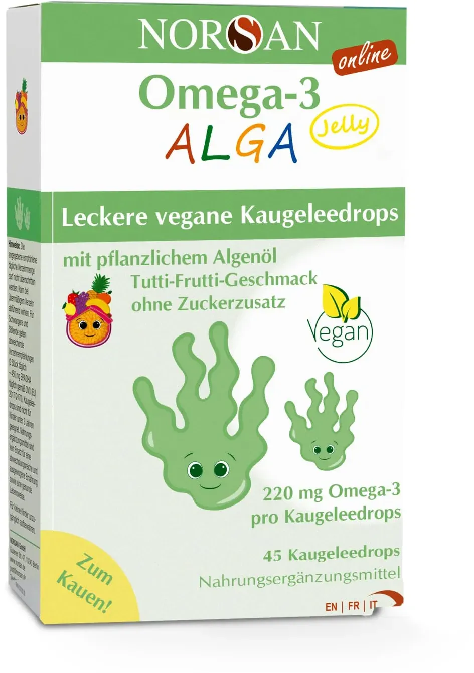 Kategorie: Nahrungsergänzungsmittel - NORSAN - GTIN:4260698151323 - KINDERLEICHT EINZUNEHMENDES OMEGA 3 AUS ALGEN - NORSAN Omega-3 ALGA Jelly, hergestellt aus pflanzlichem Algenöl, bieten hochdosierte Omega-3-Fettsäuren mit einer ausgewogenen Mischung von DHA & EPA. NORSAN OMEGA-3 VEGAN JELLYS Unsere leckeren Omega 3 Gummies mit natürlichem Tutti-Frutti-Geschmack sind frei von Zuckerzusatz & eignen sich perfekt als gesunder, kinderfreundlicher Snack. FüR DIE GESUNDE ENTWICKLUNG DEINES KINDES - Gemäß EFSA haben DHA & EPA (aus Algenöl) nachweislich positive Gesundheitseffekte auf die Herzgesundheit, Sehkraft & die kognitive Entwicklung von Kindern. UMWELTFREUNDLICH UND NACHHALTIG - Unsere Omega 3 Kinder Gummibärchen werden aus pflanzlichem Algenöl gewonnen, was die Meeresbewohner schützt und die überfischung reduziert. 220 MG mg OMEGA-3 JELLY Die NORSAN Omega-3 ALGA Jelly enthalten 220 mg Omega-3 pro Kaugeleedrops. Die empfohlene Tagesdosis richtet sich nach dem Gewicht, beispielsweise 4 Drops entsprechen insgesamt 880 mg Omega-3. - 24,95 Euro bei Amazon Marketplace Health & Personal Care - gefunden von billiger.de Medpex.de