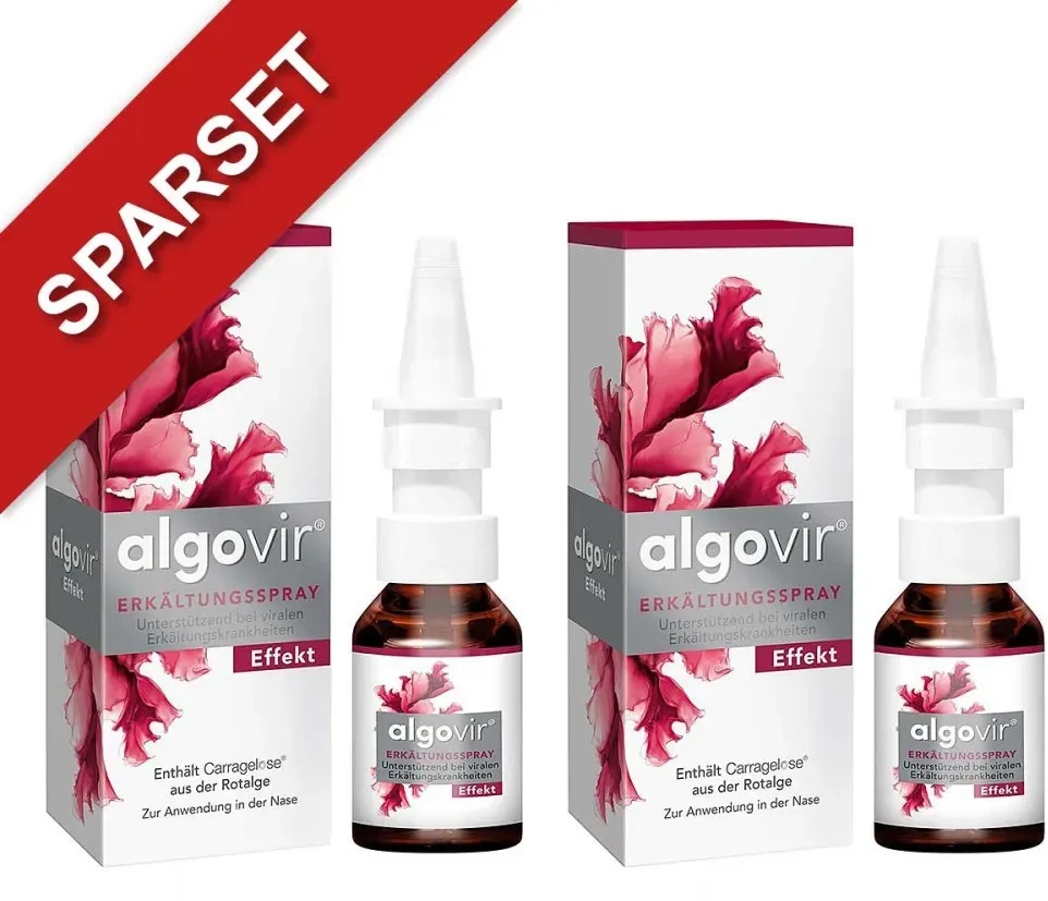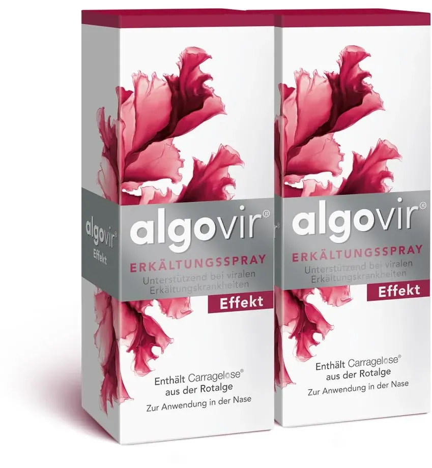 Verfügbarkeit: 1-2 Werktage - 24,49 €/Set - Kategorie: Arzneimittel - ALGOVIR - GTIN:4150800254168 - PZN:80025416 - Algovir Effekt Erw + Kinder Erkältungssp 1 Set - rezeptfrei - von Hermes Arzneimittel GmbH - - 1 Set - 24,49 Euro bei DocMorris Apotheke - gefunden von billiger.de Ein Doppelpack des Algovir Effekt Erkältungssprays, der eine gute Ersparnis gegenüber dem Einzelkauf bietet. ![]() ![]() algovir® Effekt Erkältungsspray 2 x 20 ml zur Abwehr von Erkältungsviren, kann vor einer Erkältung schützen, Nasenspray mit naturbasiertem Wirkstoff aus der Rotalge