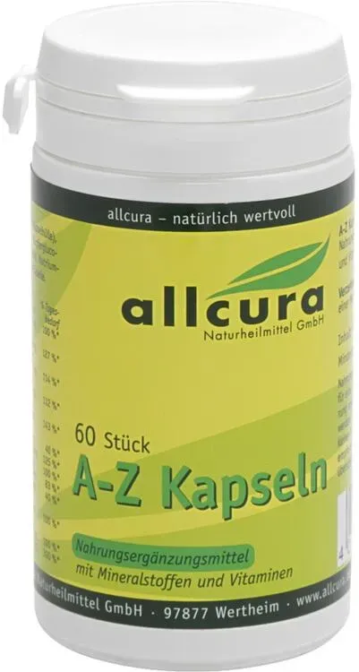 EAN: 4017893402039 - Nahrungsergänzungsmittel mit Magnesium. Magnesium trägt zur Verringerung von Müdigkeit und Ermüdung bei. Es trägt zu einem normalen Energiestoffwechsel und einer normalen Funktion des Nervensystems bei. Außerdem trägt Magnesium zum Erhalt normaler Knochen und Zähne bei. Zutaten: Magnesiumcarbonat (16% Magnesium), Füllstoffe: mikrokristalline Cellulose und Maisstärke, Trennmittel Magnesiumsalze der Speisefettsäuren. Verzehrsempfehlung: 4 Tabletten pro Tag unzerkaut mit Flüssigkeit zu den Mahlzeiten schlucken. 4 Tabletten enthalten 400 mg Magnesium und decken 107 % der Referenzmenge für die tägliche Zufuhr gemäß EU 1169 / 2011. Inhalt: 250 Tabletten a 600 mg = 150g Nahrungsergänzungsmittel sollten nicht als Ersatz für eine ausgewogene und abwechslungsreiche Ernährung sowie gesunde Lebensweise verwendet werden. Sie sollten außerhalb der Reichweite von kleinen Kindern aufbewahrt werden. Die angegebene empfohlene tägliche Verzehrsmenge darf nicht überschritten werden. - bei die-beraterapotheke.de - aus Yadore Produktdaten Dieses Angebot ist mit 7,26 Euro das günstigste für Allcura A-Z Kapseln und bietet eine gute Grundversorgung. ![]() ![]() Allcura A-Z Kapseln 60 St.