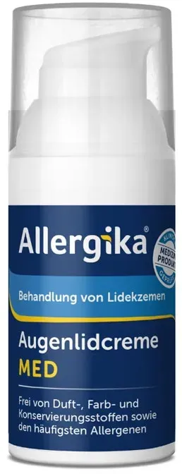 Verfügbarkeit: 1-2 Werktage - 1081,33 €/l - Kategorie: Augenpflege - Allergika - GTIN:4051452050309 - PZN:16789751 - Die ALLERGIKA®-Augenlidcreme MED ist ein kortisonfreies Medizinprodukt zur Behandlung von Lidekzemen, das durch klinische Studien belegt eine hohe Wirksamkeit aufweist. Innerhalb von nur drei Wochen konnte bei 75% der Anwender ein signifikanter Rückgang von Rötung, Schuppung und Hauttrockenheit festgestellt werden.* Diese reichhaltige Creme bietet schnelle Linderung und ist speziell für sensible Haut entwickelt. Sie eignet sich ideal bei atopischem, kontaktallergischem und irritativem Augenlidekzem. Dank einer besonderen Wasser-in-öl-Formulierung unterstützt die Creme die Regeneration der gestörten Hautbarriere. Mit einem Gehalt von 10% Glycerin kühlt die Creme, spendet Feuchtigkeit und lindert Entzündungen sowie Juckreiz. Allantoin beruhigt die Haut, während Bisabolol entzündungshemmend wirkt. Pro-Vitamin E schützt zudem vor freien Radikalen. Die ALLERGIKA®-Augenlidcreme MED ist auch für Kinder geeignet und kriecht nicht in die Augen. Der patentierte Airless-Spender gewährleistet eine hygienische Anwendung bis zur letzten Dosis. Die Creme ist frei von Duft-, Farb- und Konservierungsstoffen, Parabenen und den 328 häufigsten allergieauslösenden Stoffen der Deutschen Kontaktallergie-Gruppe (DKG). Von Dermatologen empfohlen, bietet dieses Produkt eine sichere und effektive Lösung zur Behandlung von Lidekzemen. *Quelle: MalÃcková, ... Dieses Angebot ist identisch mit dem vorherigen und bietet ebenfalls einen sehr guten Preis für die Allergika Augenlidcreme MED 15 ml Creme. ![]() Allergika Augenlidcreme MED 15 ml Creme