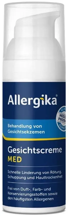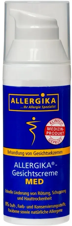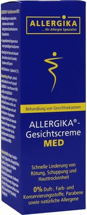 Verfügbarkeit: Lieferbar in 1-2 Werktagen - 359,20 €/l - Kategorie: Tagespflege - Allergika - GTIN:4051452050323 - PZN:17277243 - ALLERGIKA-Gesichtscreme MED ALLERGIKA®-Gesichtscreme MED ist zur Behandlung von atopischen (z. B. Neurodermitis), irritativen und kontaktallergischen Gesichtsekzemen geeignet. Das Produkt ist ebenso für Kinder geeignet. Diese Ekzeme gehen mit einer gestörten Hautbarriere, trockener Haut, Juckreiz und Rötungen einher. ALLERGIKA®-Gesichtscreme MED stellt die gestörte Hautbarriere wieder her, behebt die Hauttrockenheit, beruhigt die Haut und reduziert Rötungen und Juckreiz. Die ALLERGIKA®-Gesichtscreme MED enthält eine einzigartige Rezeptur, entwickelt auf Basis jahrzehntelanger dermatologischer Kompetenz in der Behandlung von Ekzemen. Die Wirkung auf die Hautbarriere wurde in mehreren klinischen Studien (1,2) bestätigt. Die klinische Studie wurde an 32 Patienten durchgeführt mit einem Symptomrückgang von 72% nach 3 Wochen.[1 Wohlrab, Universität Halle 2014, Wirksamkeitsstudie an 26 Probanden][2 Arenberger, Universität Prag 2021, Wirksamkeitsstudie an 32 Patienten, 3 Wochen] Wir wirkt ALLERGIKA®-Gesichtscreme MED?Ceramide und Glycerin stärken die Hautbarriere und reduzieren Rötungen. Glycerin kühlt und spendet intensiv Feuchtigkeit. Die enthaltenen natürlichen Lipide der Wasser-in-öl-Zubereitung hinterlassen einen angenehmen Schutzfilm auf der Haut und reduzieren schnell und langanhaltend Trockenheit und Schuppung. Der hohe ... Dieses Angebot ist das günstigste für die Allergika Gesichtscreme MED und bietet eine gute Möglichkeit, empfindliche Haut zu pflegen. ![]() ![]() Allergika Gesichtscreme MED 50 ml Creme