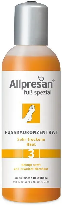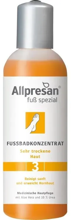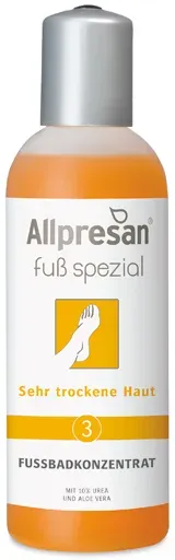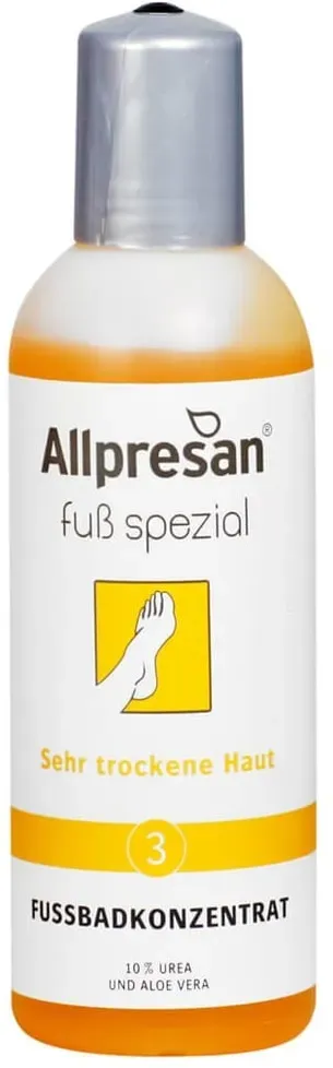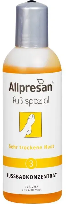 52,00 /l - Kategorie: Fußpflege - Allpresan - GTIN:4038235111815 - PZN:11006276 - Fußpflege für sehr trockene HautDas Fußbadkonzentrat sorgt für eine milde und pflegende Reinigung der Fußhaut. Dabei wird die Vorbeugung gegen Fußpilz unterstützt.Es kommt zur sanften Durchfeuchtung der Fußhaut und Erhöhung der Elastizität. - 7,80 Euro bei medpex.de - gefunden von billiger.de ![]() ![]() Allpresan Fuß Spezial Nr.3 sehr trockene Haut Fußbadkonzentrat 150 ml