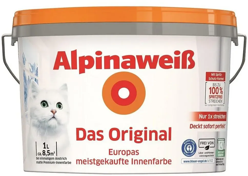 lieferbar-in 2-3 Werktagen bei dirAlpina Wandfarbe Alpinaweiß Das Original Spritzfrei 1,0 Ltr. Wand- und Deckenfarbe