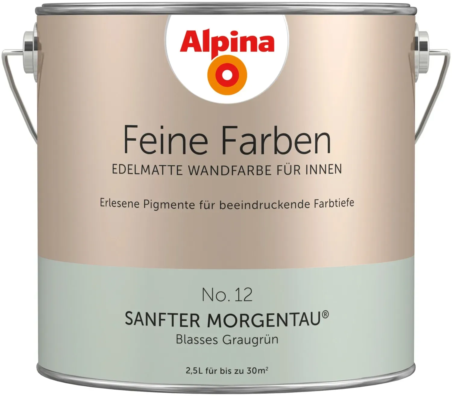 16.00 /l - Kategorie: Farben & Lacke - Alpina - GTIN:4001244766895 - Die Alpina Wand- und Deckenfarbe deckt mit einem Anstrich Neu- und Renovierungsanstriche im Innenbereich. Sie ist beständig, strapazierfähig und hochergiebig. Außerdem ist die Innenfarbe geruchsfreundlich und wasserbasiert. Die Alpina Feine Farben sind zeitlos und klassisch. In harmonischer Kombination mit Möbeln und Accessoires veredeln die Farben jeden Raum auf ihre ganz individuelle Weise. Dispersionsfarbe mit höchster Deckkraft und starker Farbintensität Die Deckenfarbe eignet sich für Putz, Beton, Mauerwerk, Gipskarton und Tapete. Dabei erzeugt die Farbe durch die Deckkraftklasse 1 ein sattes und stark deckendes Farbergebnis. Außerdem ist die Farbe durch die starken Pigmente sehr intensiv und lässt sich leicht verarbeiten. Ausgezeichnet mit dem Blauen Engel Die Wand- und Deckenfarbe basiert auf Wasser, wodurch der Raum nicht so stark nach Farbe riecht. Sie enthält keine Konservierungsmittel und ist auch für Allergiker geeignet. Die Deckenfarbe ist außerdem lösemittelfrei und mit dem Blauen Engel ausgezeichnet. Alpina Feine Farben eignen sich für folgende Innenflächen: glatte Wände und Decken (Mauerwerk, Verputz) festhaftende Raufaser- oder Strukturtapeten geeignete Vliestapetengrundierte Gipskarton- und Deckenplatten Dispersionsaltanstriche - 39,99 Euro bei OBI - gefunden von billiger.de Die Alpina Feine Farben No. 12 "Sanfter Morgentau" in Grau-Grün edelmatt ist eine weitere edle Farbnuance aus der Feine Farben Kollektion. ![]() ![]() Alpina Feine Farben No. 12 Sanfter Morgentau Grau-Grün edelmatt 2,5 l