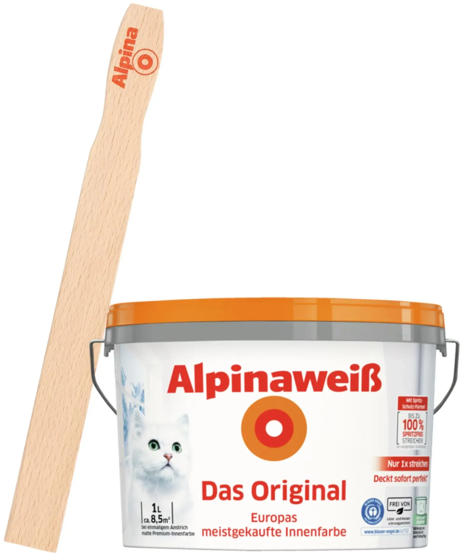 Verfügbarkeit: lieferbar-in 3-4 Werktagen bei dir - 6.87€/1l - Kategorie: Farben & Lacke - Alpina - GTIN:5413436068974 - Oberflächenoptik , glatt, Glanzgrad , Matt, Farbe , Flaschengeist, Eigenschaften , luftreinigende Wandfarbe, Anwendungsbereich , Innen, Wand, Art Verarbeitung , streichen, Empfohlen Anzahl Anstriche , 2, Anwendungstemperatur minimal , 20 °C, Trocknungszeit , 12 Std., Belastbar nach , 24 Std., überstreichbar nach , 12 Std., Art Verpackung , Dose, Inhalt in Liter , 2.5 l, Gewicht , 4 kg, Signalwort , kein, Gefahrenhinweise , keine, Sicherheitshinweise , Sicherheitsdatenblatt auf Anfrage erhältlich, Verarbeitungshinweis , streichen, Sprachen Bedienungs-/Aufbauanleitung , deutsch, Herstellungsland , Belgien, - 17,17 Euro bei OTTO - gefunden von billiger.de Dieses Angebot ist empfehlenswert für alle, die eine kleine Menge der klassischen Alpinaweiß Wandfarbe für Ausbesserungen oder kleine Projekte suchen. ![]() ![]() Alpinaweiß Das Original €“ optimal deckende und ergiebige weiße Wandfarbe €“ mit Spritz-Schutz-Formel €“ mit Rührholz (1 Liter)