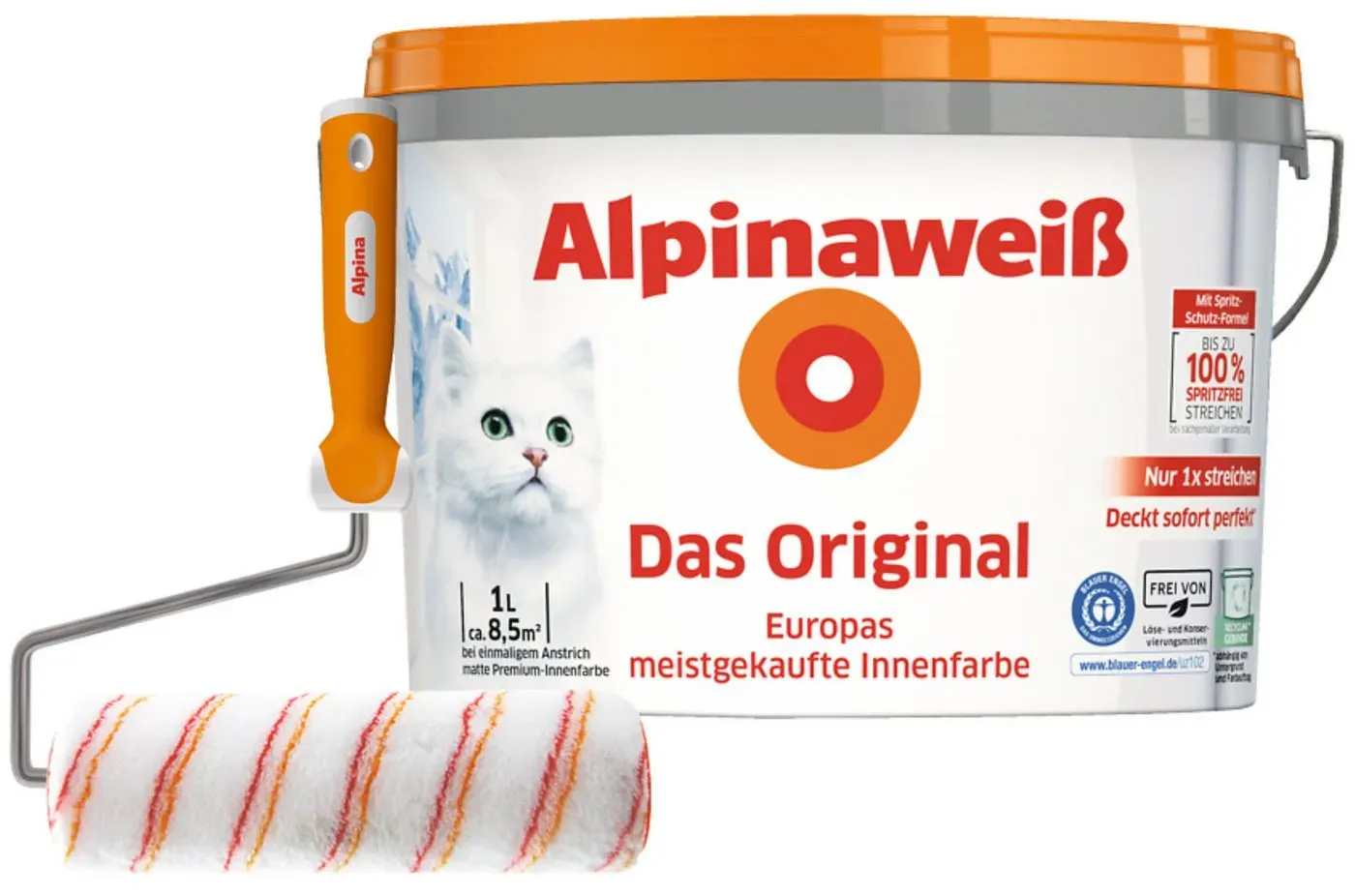 lieferbar-in 2-3 Werktagen bei dirAlpina Wandfarbe - SET - Alpinaweiß Das Original + Spritz-Schutz Spezialroller