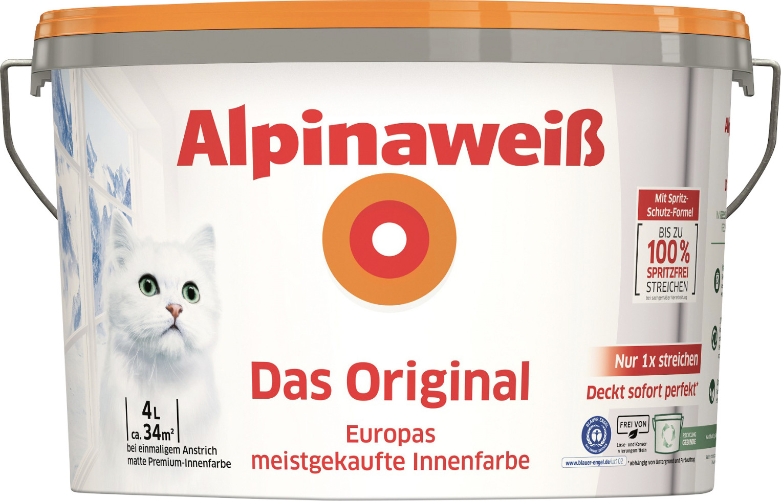 17 Händlerangebote bei billiger.de - Kategorie: Farben & Lacke - Alpina - Seit über 10 n bringt Alpinaweiß strahlendes Weiß an die Wände ganzer Generationen. Sie ist die Innenfarbe, der die meisten Menschen in Europa vertrauen. Alpinaweiß, Europas meistgekaufte Innenfarbe, gibt es ab sofort im neuen ressourcenschonenden Recycling-Gebinde. Dieses Gebinde besteht zu mindestens 70% aus recyceltem Kunststoff-Rücklauf privater Haushalte (ohne Deckel) und ist zu 100% recyclebar. Damit leistet Alpina einen wertvollen Beitrag für mehr Nachhaltigkeit bei weißen Innenfarben. Holen Sie sich jetzt das spritzfreie Alpinaweiß Das Original in Ihr Zuhause. Das Spitzenprodukt aus dem Hause Alpina deckt sofort perfekt und ermöglicht bei sachgemäßer Verarbeitung bis zu 100% spritzfreies Streichen. Alpinaweiß ist noch ergiebiger und frei von Löse- und Konservierungsmitteln und kann mit handelsüblichen Rollern ganz leicht verarbeitet werden. Es empfiehlt sich jedoch die Verwendung des Alpina Spritz-Schutz-Spezialrollers, weil dadurch das Risiko von Spritzern und Tropfen bei der Verarbeitung minimiert werden kann. - GTIN:4001244796472 ![]() ![]() Alpinaweiß Das Original optimal deckende und ergiebige weiße Wandfarbe mit Spritz-Schutz-Formel 4 Liter