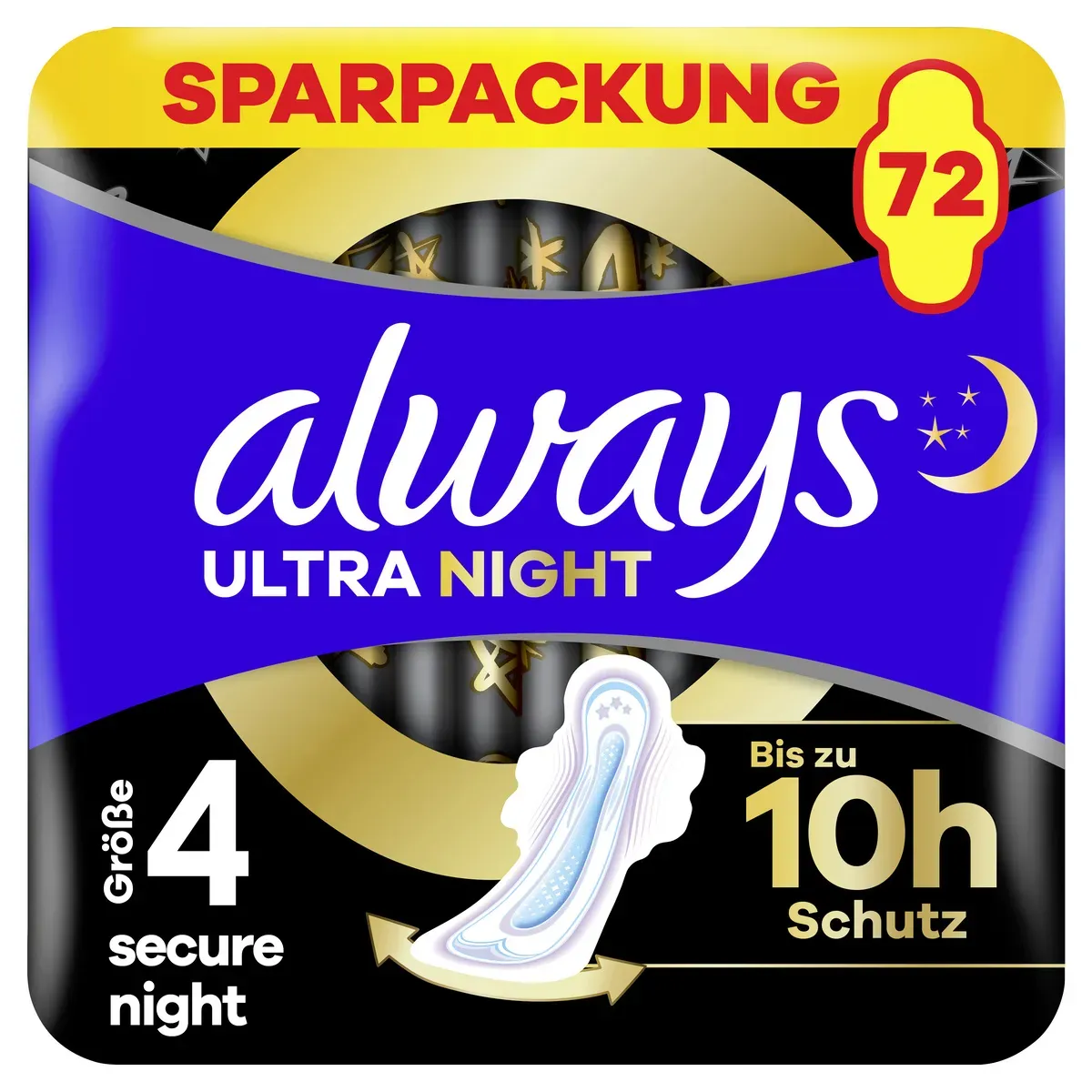 ALWAYS - EAN: 8006540546222 - (656713198) Always Ultra Night Damenbinden (Größe 4) 72 Stück Gib dich nicht mit nicht weniger zufrieden als mit einem guten Schlaf mit bis zu 10 Std. Schutz: Always Ultra Secure Night (Größe 4) Damenbinden mit Flügeln und saugstarker und weicher Ob - bei 0815.eu - aus Yadore Produktdaten Dieses Sparpack für 16,99 Euro ist eine gute Option für alle, die einen gröÃ?eren Vorrat an Always Ultra Secure Night Binden benötigen. ![]() ![]() always Binden ultra secure night mit Flügel Sparpack
