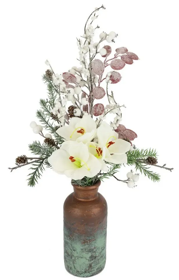 Die Amaryllis wird in einem cremefarbenen Topf (13 x 12 cm) mit Holzschneeflocke geliefert. Die Amaryllis ist mit silberfarbenem Schleierkraut Kieferzweigen und Moos zum Abdecken dekoriert.Hinweis: Die Pflanze ist winterhart. Hersteller:FloraPrima GmbHDidderser Str. 2838176 Wendeburginfo@floraprima.de - bei floraprima.de - aus Yadore Produktdaten Dieses winterliche Kunstpflanzen-Gesteck mit Amaryllis in einer Keramikvase bietet eine komplette und ansprechende Weihnachtsdekoration. ![]() ![]() Winterliche Kunstpflanze Gesteck mit Amaryllis in Vase aus Keramik, Kunstblumen-Arrangement, Amaryllis, Tanne, I.GE.A., Höhe 52 cm, Weihnachtsdeko mit Blüten, Zweigen mit Zapfen, Beeren und Eukalyptus weiß