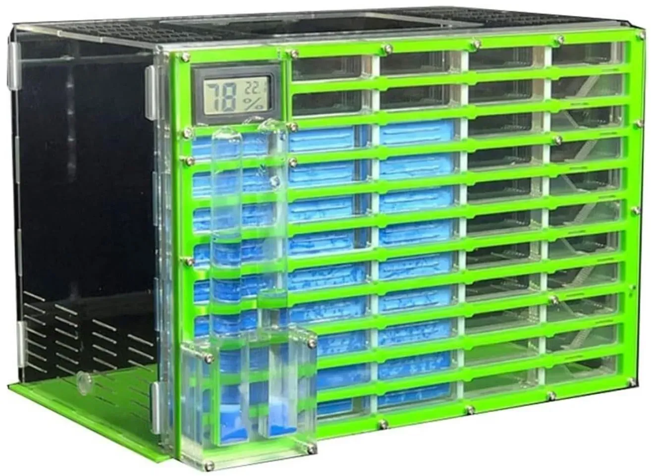 Kategorie: Sonstige Elektroinstallationsartikel - rimsunta - GTIN:0752815223999 - Maße (L x B x H): 27,0 x 25,0 x 13,0 cm Modulares Design: Das Nest besteht aus drei rechteckigen Kammern, jede mit einer eigenen magnetischen Glasabdeckung. Dieses Design ermöglicht es dem Hausmeister, nach und nach neue Kammern zu öffnen, während die Ameisenkolonie wächst, wodurch die Ameisen sich in einem großen, dünn besiedelten Nest unsicher fühlen, was das Koloniewachstum beschleunigen kann. Rote Lichtabdeckungen: Jede Glasabdeckung ist mit einer zusätzlichen roten Abdeckung versehen, um zu verhindern, dass Lichtveränderungen die Kolonie stören, um sicherzustellen, dass sie in einer dunklen Umgebung gedeihen können. Schöner Aktivitätsbereich: Der Aktivitätsbereich verfügt über Miniatur-Steingärten und Pflanzenlandschaften, die die Erkundung für die Ameisen angenehmer machen. Er enthält auch einen externen Wasserturm und einen Abfallbereich, wodurch es für Hausmeister leicht ist, Wasser aufzufüllen und Abfall zu reinigen. Luftfeuchte-Wasserspeicher: Im Inneren des Nestes befinden sich Wasserspeicher, die über seitliche Löcher mit Tropfbewässerung nachgefüllt werden können, um eine feuchte Umgebung zu erhalten, die für Ameisen geeignet ist. - 99,99 Euro bei Amazon Marketplace Lawn & Garden - gefunden von billiger.de Diese professionelle, große Acryl-Ameisenfarm mit 11 Schichten bietet viel Platz und ist ideal für fortgeschrittene Ameisenhalter. ![]() ![]()
