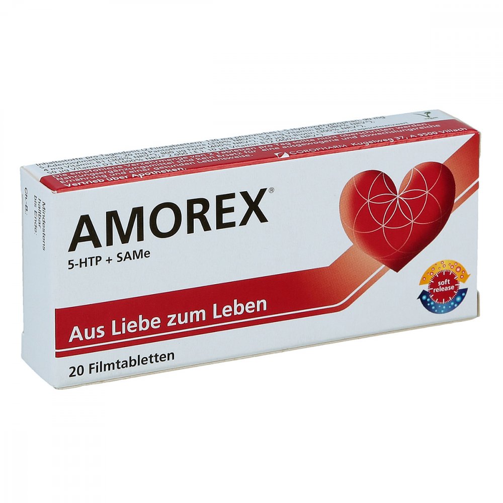 0,81€ / 1 st - Kategorie: Arzneimittel - COROPHARM GmbH - GTIN:9120039110011 - PZN:09089042 - Amorex 5-Htp und SAMe Filmtabletten 20 St von COROPHARM GmbH günstig bei Ihrer Beraterapotheke bestellen - 16,27 Euro bei Beraterapotheke - gefunden von billiger.de ![]() ![]() COROPHARM GmbH Amorex Tabletten bei Liebeskummer und Trennung