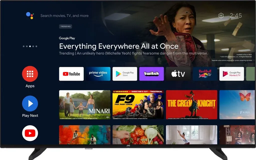 EEK: E - Kategorie: Fernseher - JVC - GTIN:4975769478369 - In elegantem Design vereint der LT-50VA3355 Android TV von JVC alles, was Fernsehen heute zum Erlebnis für Sie und Ihre Familie macht. Das auf eine Bildschirmdiagonale von 126 cm (50 Zoll) dargestellte Bild überzeugt dank der 4K UHD Auflösung, Dolby Vision HDR, Super Resolution und Micro Dimming durch eine beeindruckende Schärfe. Dank integriertem Triple-Tuner DVB-C/T2/S2 empfangen Sie Fernsehprogramme über Satellit, Kabel oder Antenne direkt auf Ihrem TV, ganz ohne zusätzlichen Receiver. Außerdem sorgen zahlreiche Anschlüsse, wie 3x HDMI (CEC + ARC), 2x USB mit Multimedia Player uvm. für multimediale Flexibilität und Vielfalt. Das Android Betriebssystem hebt das smarte Fernsehzeitalter auf die nächste Stufe. Dank der vielfältigen Möglichkeiten, der einfachen Bedienbarkeit und der individuellen Zusammenstellung Ihrer Lieblingsapps aus dem Play Store werden Sie zum Baumeister Ihres ganz persönlichen Smart TVs. Leistung, Energieverbrauch & Umwelt:Marke: JVCProdukt-Name: LT-50VA3355 (Skala A bis G)Bildschirmdiagonale in cm: 126Bildschirmdiagonale in Zoll: 50Leistungsaufnahme im Ein-Zustand bei Standard-Dynamikumfang (SDR): 54 WLeistungsaufnahme im Ein-Zustand bei hohem Dynamikumfang (HDR): 101 WLeistungsaufnahme Standby/Aus: 0,5 Watt / -Stromversorgung: AC220-240V 50Hz Bild:Auflösung: 3840x2160 (4K Ultra HD)Seitenverhältnis: 16:9Bildschirmtechnologie: LEDHelligkeit (cd/m2): 275Bildwiederholungsfrequenz: 50 HzDolby ... Ein 43-Zoll Xiaomi Smart TV mit 4K UHD und Android TV, der ein rahmenloses Design und Dolby Vision für ein modernes Heimkinoerlebnis bietet. ![]() ![]() Xiaomi Smart TV A2 43 Zoll (Rahmenloses Metalldesign, UHD, Dolby Vision, HDR 10, Triple Tuner, Android TV, Prime Video, Netflix, Google Assistant, Bluetooth, HDMI 2.1, USB) [Modell 2022]