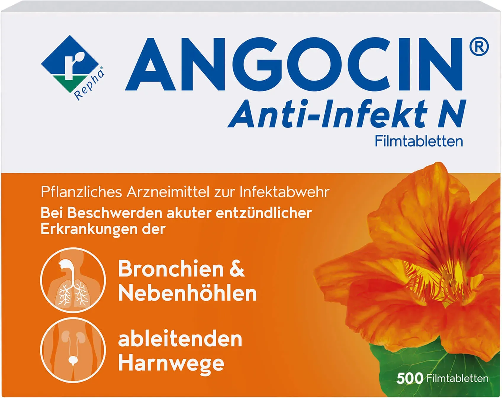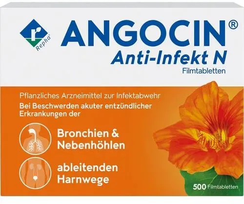 0.14 eur / 1st - 'Arzneimittel-Gesundheit Erkältung & Immunsystem Erkältungspräparate','Arzneimittel-Gesundheit Erkältung & Immunsystem Abwehrstärkung','Arzneimittel-Gesundheit Erkältung & Immunsystem Husten','Kosmetik Urlaub & Sonne Reise Sets','Arzneimittel-Gesundheit Homöopathie & Natur Homöopathische Komplexmittel Erkältung','Arzneimittel-Gesundheit Erkältung & Immunsystem Schnupfen & Nebenhöhlen','Arzneimittel-Gesundheit Homöopathie & Natur Homöopathische Komplexmittel Frauenleiden' Vitamine & Ergänzungen - EAN:4150068929273 - Pflanzliches Arzneimittel zur InfektabwehrANGOCIN Anti-Infekt N ist ein pflanzliches Arzneimittel aus Kapuzinerkresse und Meerrettichwurzel und wird eingesetzt zur Besserung der Beschwerden bei Infekten der Atem- und Harnwege.ANGOCIN Anti-Infekt N - das Wichtigste auf einen Blick:Kapuzinerkresse und Meerrettich enthalten als Wirkstoff die sogenannten Senföle.Senföle wirken antientzündlich und lindern die typischen Symptome bei Atem- und Harnwegsinfekten.Durch die Ausscheidung über die Harn- und Atemwege liegt hier die höchste Wirkstoffkonzentration vor - genau dort wo die Infektion die Symptome verursacht. ANGOCIN Anti-Infekt N ist zugelassen für Kinder ab n.Wieso kann ANGOCIN Anti-Infekt N sowohl bei einer Erkältung (grippaler Effekt) als auch bei einer Blasenentzündung helfen?Die Antwort darauf ist der einzigartige Wirkmechanismus. Die Senföle werden über die Atem- und Harnwege ausgeschieden, genau hier befinden sich die Bakterien oder Viren, ... ![]() ![]() Repha ANGOCIN Anti Infekt N Filmtabletten 500 St