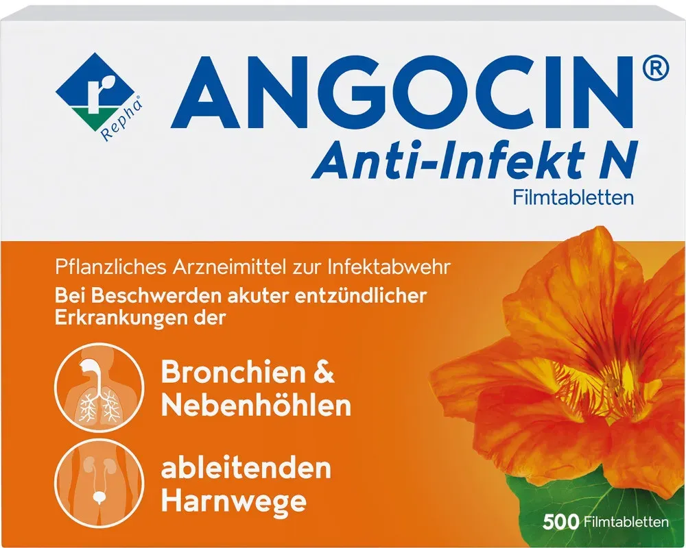 0,13 /Stück - Kategorie: Arzneimittel - Repha - GTIN:4150068929273 - PZN:06892927 - Angocin Anti-Infekt N ANGOCIN Anti-Infekt N ist ein pflanzliches Arzneimittel zur Infektabwehr. Die Wirkstoffe sind Isothiocyanate (Senföle) aus - Kapuzinerkresse - Meerrettich ANGOCIN Anti-Infekt N wird angewendet: zur Besserung der Beschwerden bei akuten entzündlichen Erkrankungen der Bronchien, Nebenhöhlen und ableitenden Harnwege. - 62,83 Euro bei medikamente-per-klick.de - gefunden von billiger.de ![]() ![]() Repha Angocin Anti-Infekt N Filmtabletten 500 St