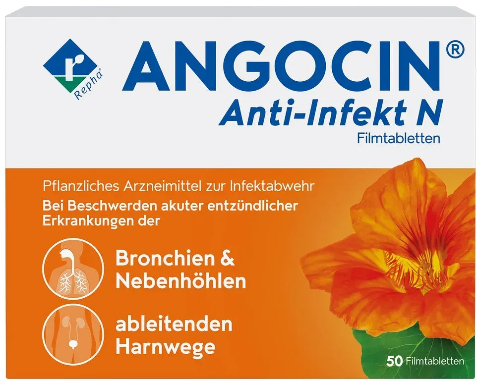 0,13 /St - Kategorie: Arzneimittel - Repha - GTIN:4150066127671 - PZN:06612767 - Pflanzliches Arzneimittel zur InfektabwehrANGOCIN Anti-Infekt N ist ein pflanzliches Arzneimittel aus Kapuzinerkresse und Meerrettichwurzel und wird eingesetzt zur Besserung der Beschwerden bei Infekten der Atem- und Harnwege.ANGOCIN Anti-Infekt N das Wichtigste auf einen Blick:Kapuzinerkresse und Meerrettich enthalten als Wirkstoff die sogenannten Senföle.Senföle wirken antientzündlich und lindern die typischen Symptome bei Atem- und Harnwegsinfekten.Durch die Ausscheidung über die Harn- und Atemwege liegt hier die höchste Wirkstoffkonzentration vor genau dort wo die Infektion die Symptome verursacht. ANGOCIN Anti-Infekt N ist zugelassen für Kinder ab n.Wieso kann ANGOCIN Anti-Infekt N sowohl bei einer Erkältung (grippaler Effekt) als auch bei einer Blasenentzündung helfen?Die Antwort darauf ist der einzigartige Wirkmechanismus. Die Senföle werden über die Atem- und Harnwege ausgeschieden, genau hier befinden sich die Bakterien oder Viren, die die Infektion ausgelöst haben und eine Entzündung der umliegenden Schleimhäute verursachen.Hier liegen die Senföle hochkonzentriert vor und können so bei einer Erkältung und einer Blasenentzündung (Harnwegsinfekt) ihre Wirkung entfalten und die Beschwerden lindern. Pflichttext Fachkreise ANGOCIN Anti-Infekt N ANGOCIN Anti-Infekt NAnwendungsgebiete: Zur Besserung der Beschwerden bei akuten entzündlichen Erkrankungen der Bronchien, Nebenhöhlen und ... Dieses Angebot ist eine Standard-200-Stück-Packung von einer großen Online-Apotheke. ![]() Angocin Anti Infekt N Filmtabletten 200 St